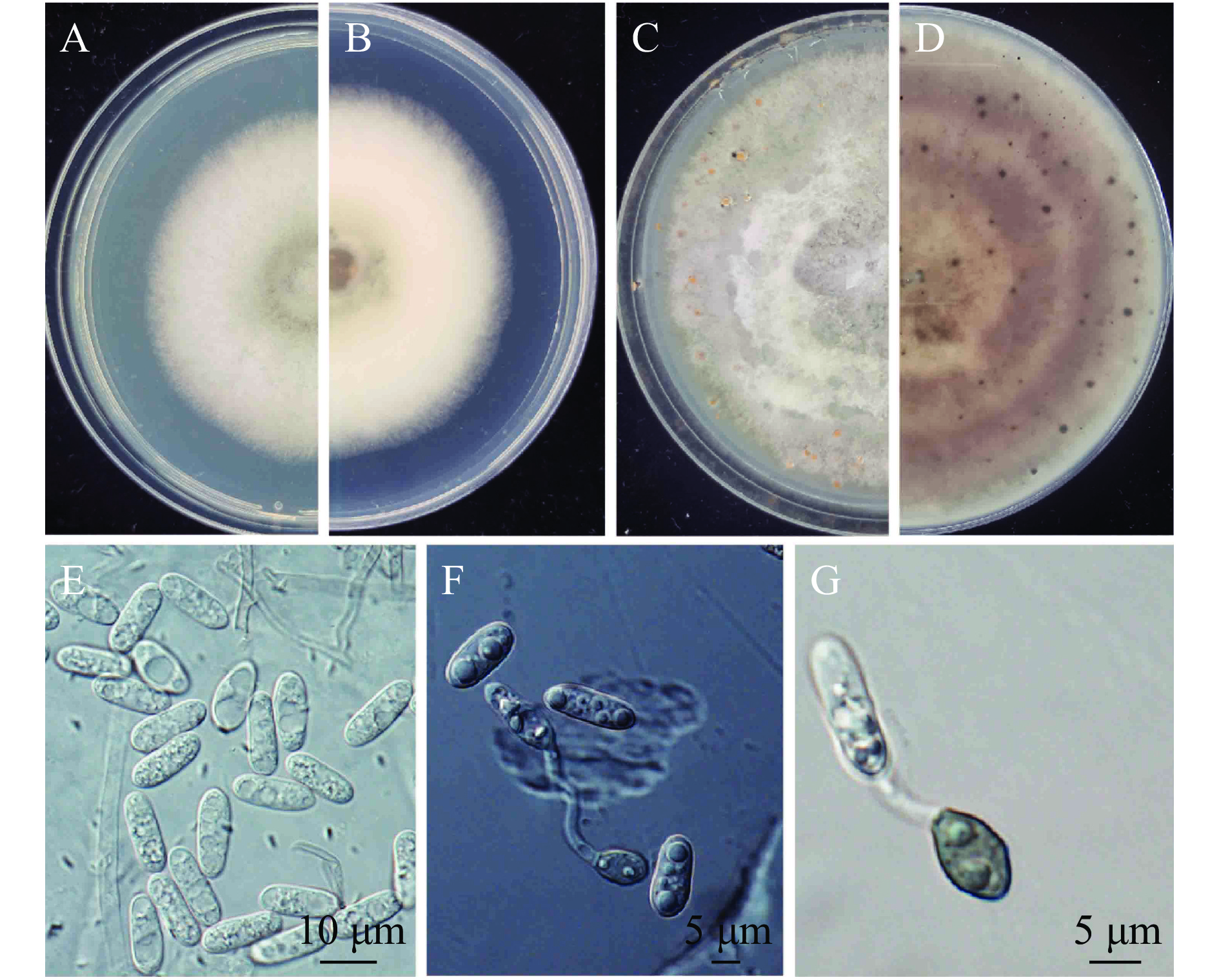 图 3 炭疽病菌株的菌落形态和显微形态 Fig. 3 Colony morphology and microscopic characters of Colletotrichum isolates A和B:培养8 d后正、反面菌落;C和D:培养15 d后正、反面菌落;E: 孢子;F和G:附着孢 A and B indicate upper and reverse of cultures 4 days after inoculation; C and D indicate upper and reverse of cultures 15 days after inoculation; E: conidia; F and G indicate appressoria |