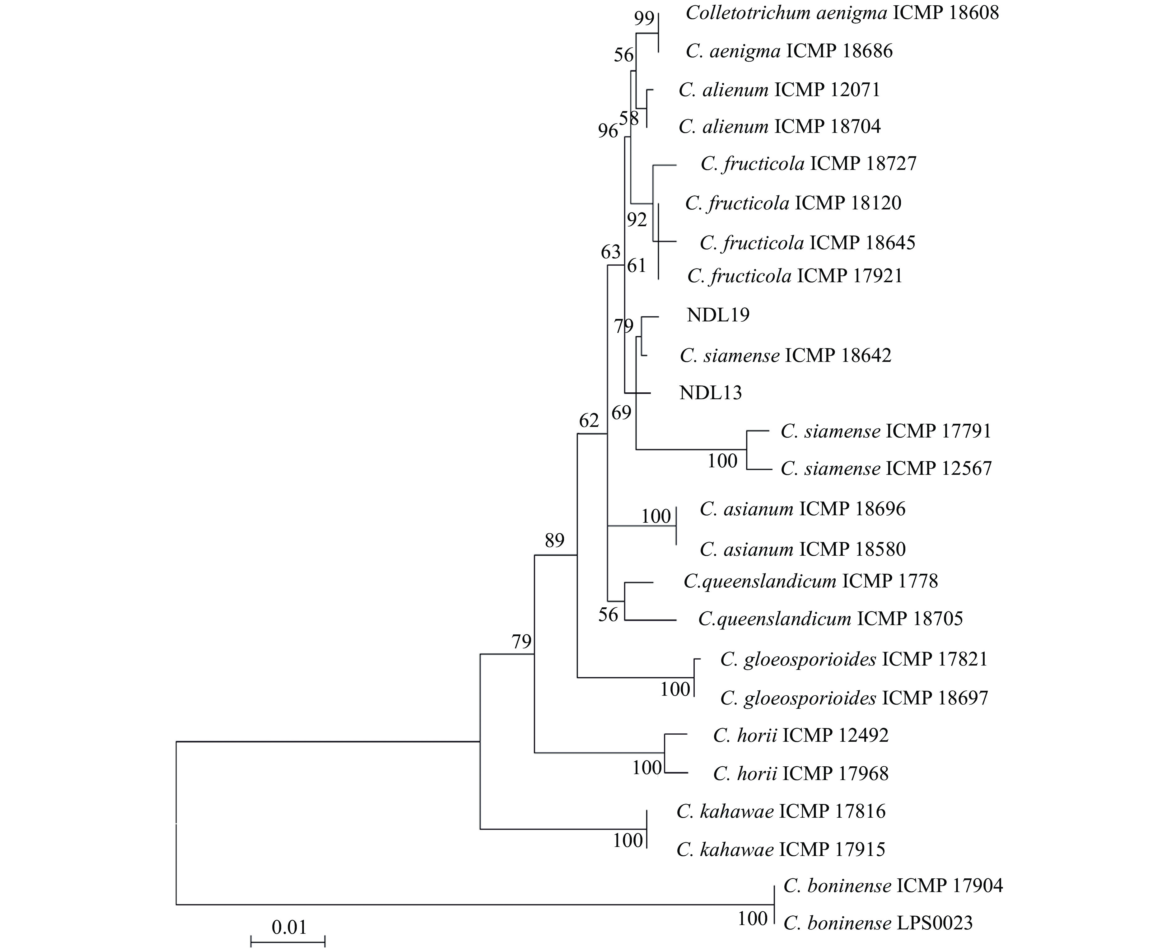 将菌株NDL13和NDL19的ITS、CHS、GAPDH、ACT和TUB2这5个基因的序列与从GenBank中下载得到的21个模式菌株或公认菌株相应的序列进行比对,以C. boninense为外类群构建的系统发育树如图4所示,病原菌NDL13和NDL19均与暹罗刺盘孢C. siamense聚在一起,形成一个明显的分支,且各分支间均有较高的支持率,因此确定美丽崖豆藤炭疽病的病原菌为暹罗刺盘孢C. siamense。