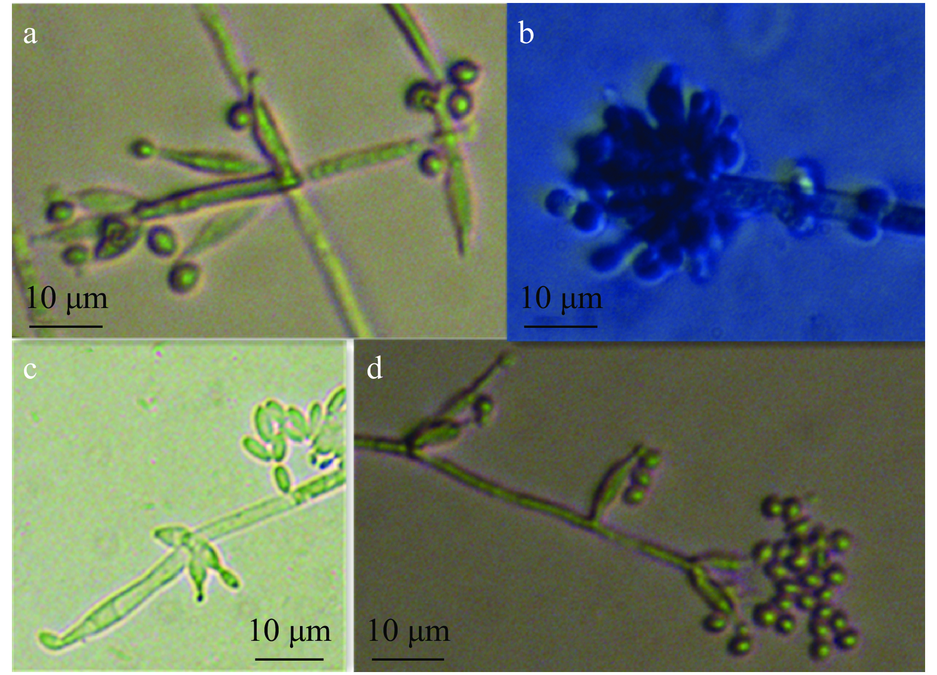 图 1 4种棒束孢菌株的产孢结构及孢子形态 Fig. 1 Sporulation structure and spore morphology of four Isaria strains a:玫烟色棒束孢;b:环链棒束孢;c:爪哇棒束孢;d:粉棒束孢 a: Isaria fumosorosea; b: Isaria cateniannulate; c: Isaria javanica; d: Isaria farinosa |