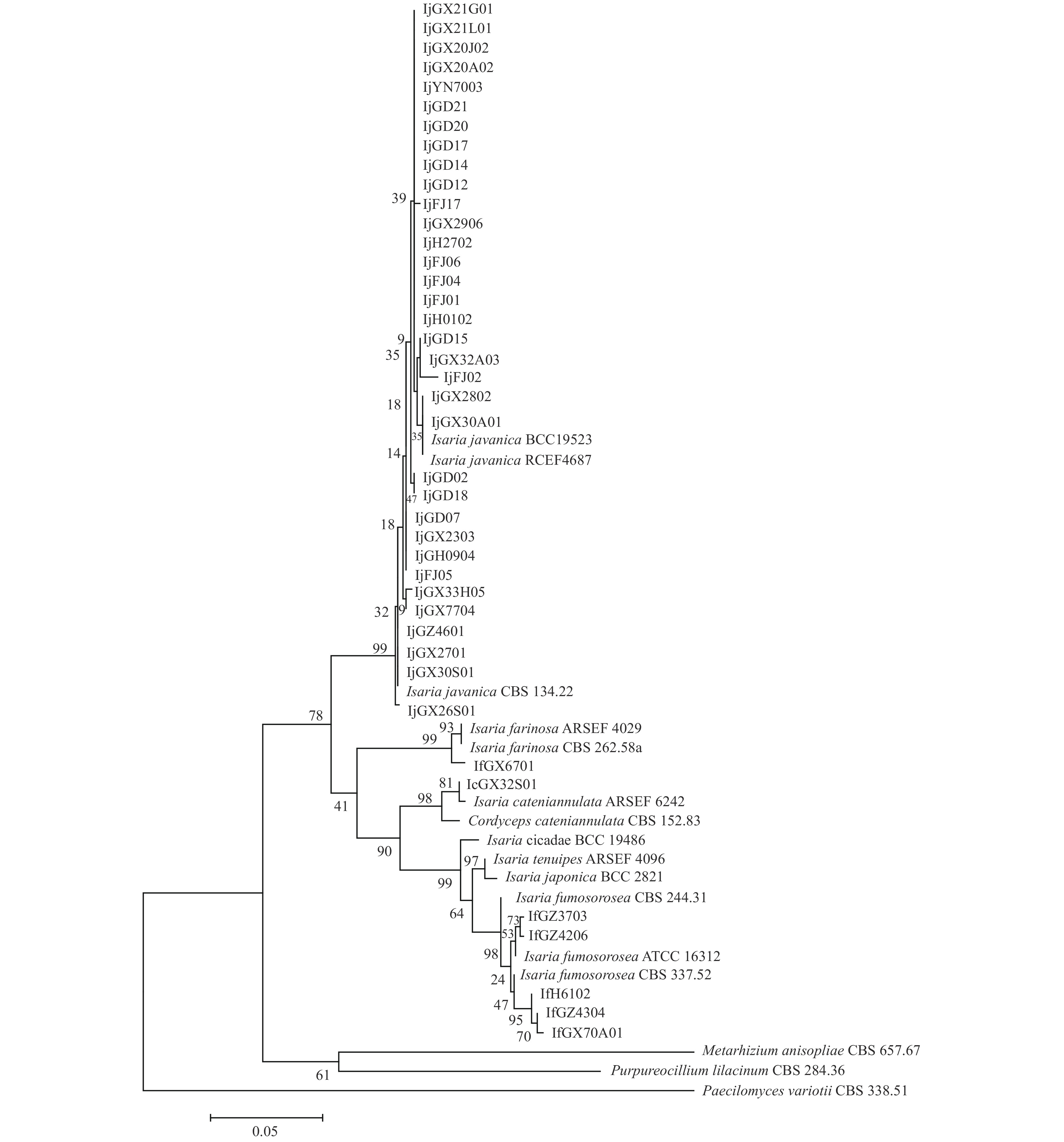 图 2 基于棒束孢菌株ITS序列构建的系统发育树 Fig. 2 Phylogenetic tree based on ITS sequence of Isaria strains |