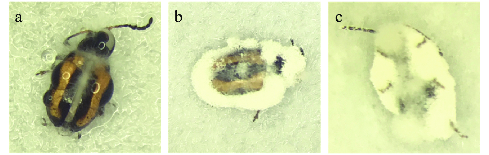 图 4 菌株IfH6102侵染黄曲条跳甲不同时间的形态 Fig. 4 Characteristics of Phyllotreta striolata after infected by strain IfH6102 for different time a:死亡后3 d(背部);b:死亡后7 d(背部);c:死亡后11 d(腹部) a: Three days after death (back); b: Seven days after death (back); c:11 days after death (abdomen) |
