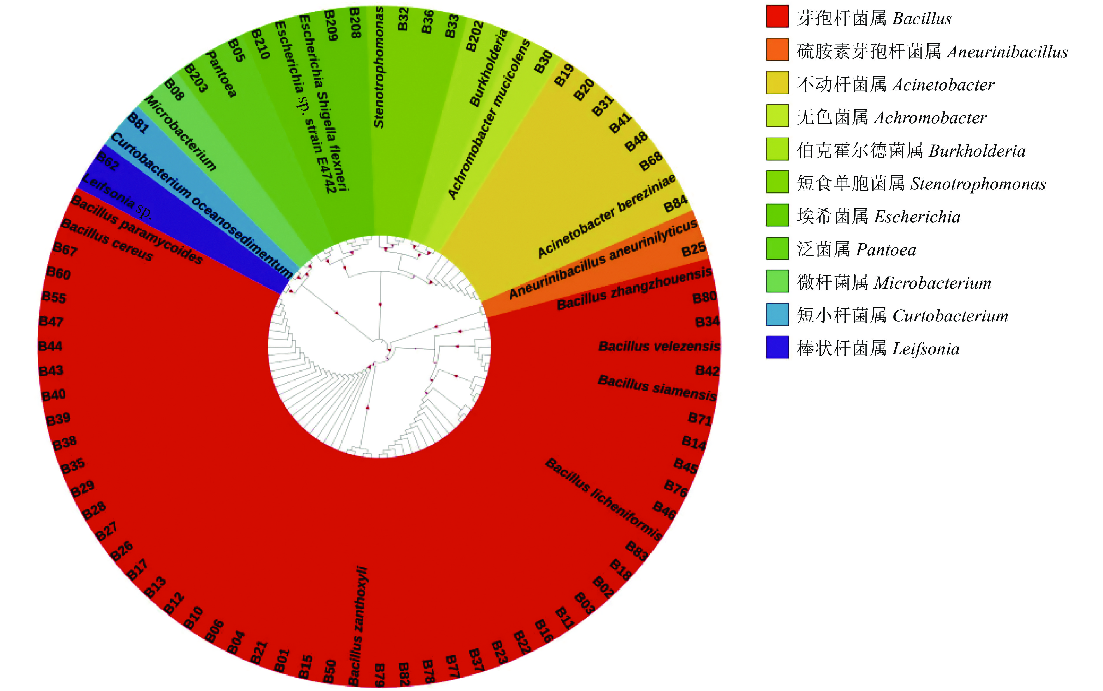 图 1 基于16S rDNA建立的部分铁皮石斛内生细菌系统发育树 Fig. 1 Phylogenetic tree based on 16S rDNA gene sequence of partial endophytic bacteria isolated from the Dendrobium officinal |
