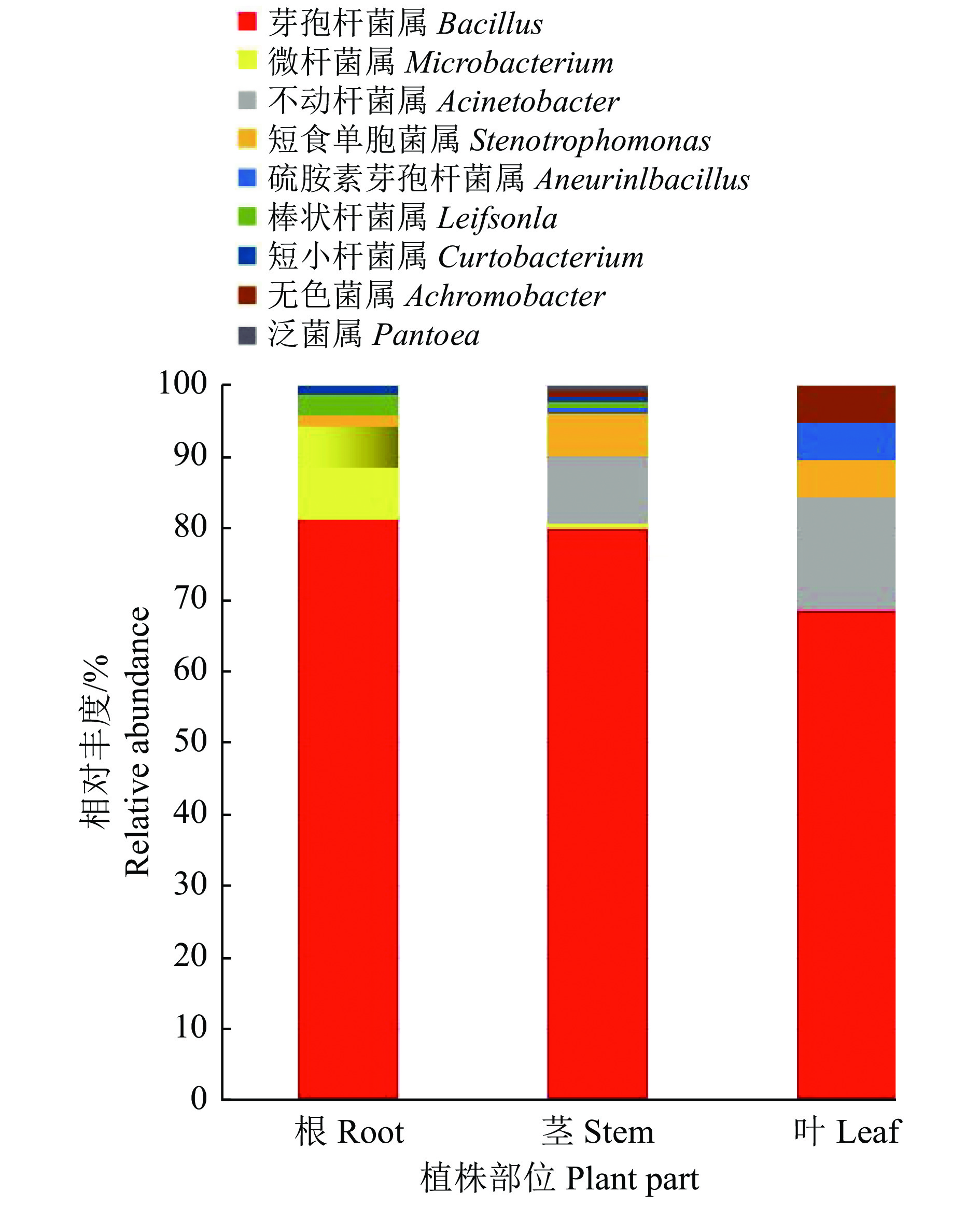 2 结果与分析 2.1 野生与人工栽培铁皮石斛内生细菌的类群结构从野生铁皮石斛植株中分离到217株内生细菌,根据测序比对和系统发育分析结果,内生细菌可以归类为芽孢杆菌属Bacillus、微杆菌属Microbacterium、不动杆菌属Acinetobacter、短食单胞菌属Stenotrophomonas、硫胺素芽孢杆菌属Aneurinibacillus、棒状杆菌属Leifsonia、短小杆菌属Curtobacterium、无色菌属Achromobacter、泛菌属Pantoea等9个属(隶属于3个门)(图1)。其中芽孢杆菌属和不动杆菌属菌株数分别占总分离菌株数的79.26%和8.76%,为优势菌群。野生铁皮石斛不同组织内生细菌类群结构存在差异(图2)。分离自根的内生细菌有70株,优势菌群是芽孢杆菌属(占根部分离菌株的81.16%)、微杆菌属(7.25%)和不动杆菌属(5.8%)。来自茎的内生细菌有128株,优势菌群是芽孢杆菌属(占茎部分离菌株的79.84%)、不动杆菌属(9.3%)和短食单胞菌属(6.2%)。叶中分离到19株细菌,以芽孢杆菌属(占叶部分离菌株的68.42%)、不动杆菌属(15.79%)为优势菌群。芽孢杆菌属、不动杆菌属、短食单胞菌属存在于野生铁皮石斛根、茎、叶各组织部位。