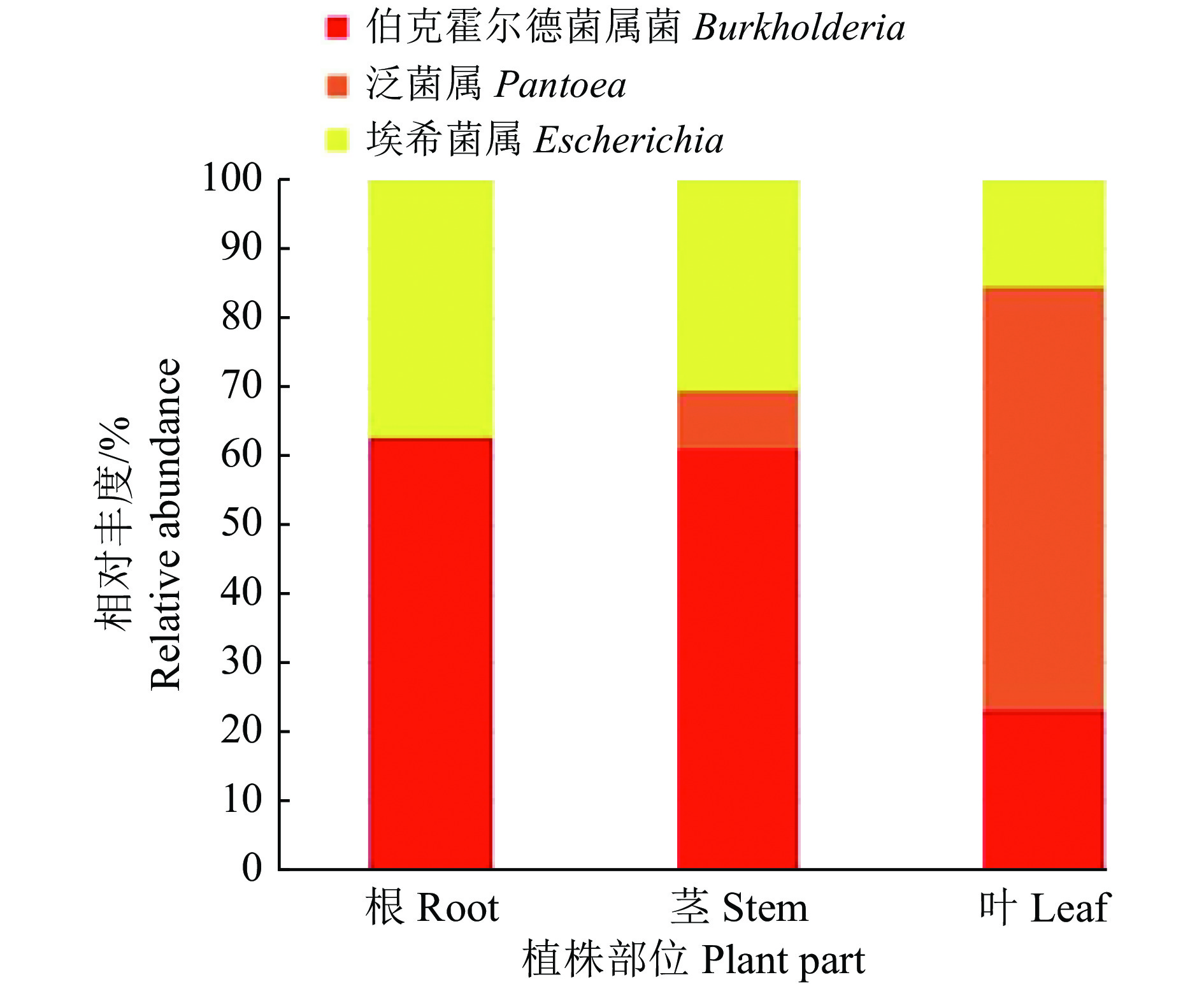 从人工栽培铁皮石斛植株中分离到68株内生细菌,归类为伯克霍尔德菌属Burkholderia、埃希菌属Escherichia、泛菌属Pantoea 3个属(隶属于1个门)(图1)。其中伯克霍尔德菌属和埃希菌属分别占总分离菌株数的54.41%和30.88%,为优势菌群。人工栽培铁皮石斛不同组织内生细菌类群结构存在差异(图3)。根中分离到细菌34株,茎中分离到细菌22株,均以伯克霍尔德菌属(占根部分离菌株的62.5%,占茎部分离菌株的60.87%)和埃希菌属(占根部分离菌株的37.5%,占茎部分离菌株的30.43%)为优势菌群,并且这2个菌群也存在于叶中。叶中分离到细菌12株,以泛菌属(61.54%)为优势菌群。
