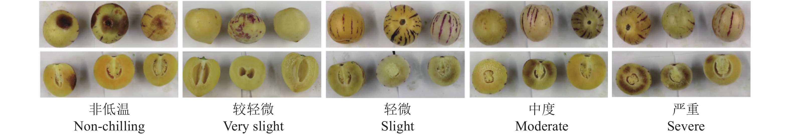 1.3 指标测定方法 1.3.1 冷害指数人参果的冷害首先在果肉中的表现为与果皮褐变相关的果肉成半透明状,之后果皮上呈现褐斑[25]。采用Domingo等[26]方法稍作修改,由9个经过培训的专业人员组成的评定小组,对不同时间点的冷害发生情况进行评定,评定标准为非冷害0分、较轻微1分、轻微2分、中度3分和严重4分,参照图片如图1所示,冷害指数计算公式如下所示: