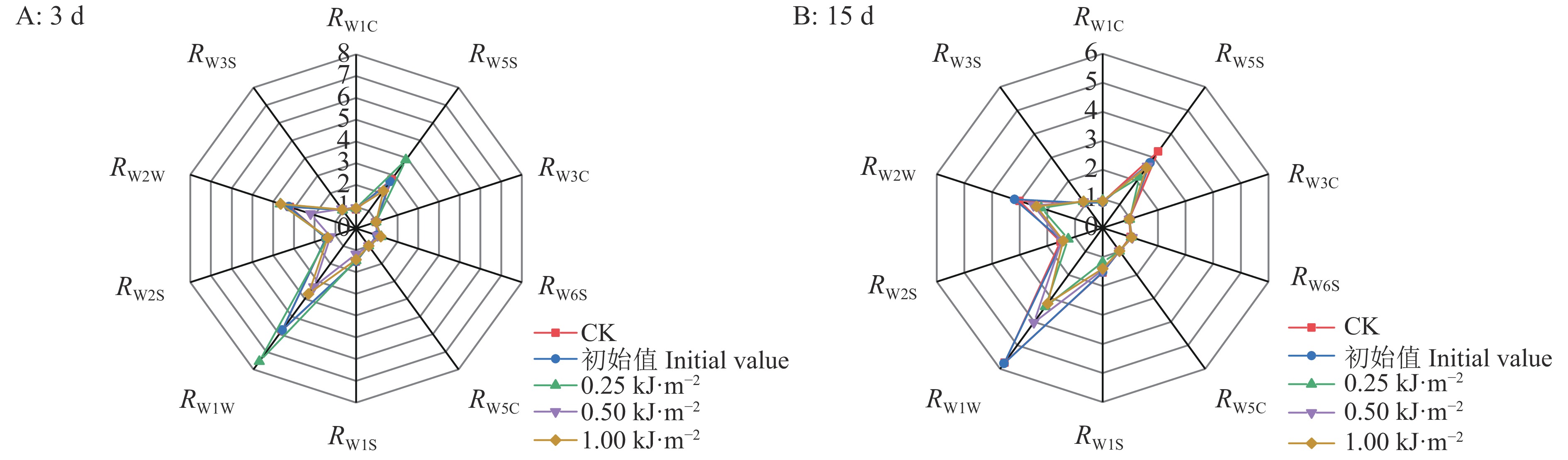 LDA即将原始数据映射到低维的方向,以响应值的空间分布状态即彼此之间的投影距离表现出组与组之间的关系,更直观地观察到组与组之间分类情况[31]。由图9可知,在5 ℃贮藏的第3天和第15天,第一判别式贡献率(LD1)、第二判别式贡献率(LD2)之和分别为98.79%和97.06%,2个判别式的贡献率大于95%,说明可以判别各处理组分类情况。在贮藏第3天和第15天,UV-C处理组和对照组之间无重叠区域,且对照组相距初始值较远(距离越大表明变化越快、越明显),这说明在贮藏第3天和第15天,UV-C处理与对照组分析结果具有高区分度。0.25 kJ·m−2处理组与0.50和1.00 kJ·m−2处理组间亦有差异,但0.50和1.00 kJ·m−2处理组间无明显区分度。结合图10可知,各处理组间的10个传感器响应值之间差异较大的是W1W(无机硫化物)、W2W(有机硫化物和芳香成分)和W5S(氮氧化合物),这说明人参果在低温条件下贮藏,挥发性风味物质的变化主要是硫化物、芳香成分和氮氧化合物,对照组在贮藏第15天硫化物(W1W)丰度变化最为显著,说明冷害对组织细胞破坏严重,导致硫化物等挥发性成分的形成,产生不良风味,进而影响产品的感官品质。在贮藏第15天,UV-C处理组(0.25、0.50和1.00 kJ·m−2)无机硫化物(W1W)、有机硫化物和芳香成分(W2W)、氮氧化合物(W5S)丰度变化与初值稍有差异,但是1.00 kJ·m−2 UV-C处理的人参果挥发性风味物质丰度与初始值相似,这可能是因为不同剂量的UV-C处理延缓人参果贮藏期间冷害发生速率的差异所致,UV-C处理可延缓人参果冷藏期间挥发性风味物质的变化,尤其是无机硫化物的生成,其中1.00 kJ·m−2的UV-C处理保持其风味效果最佳。