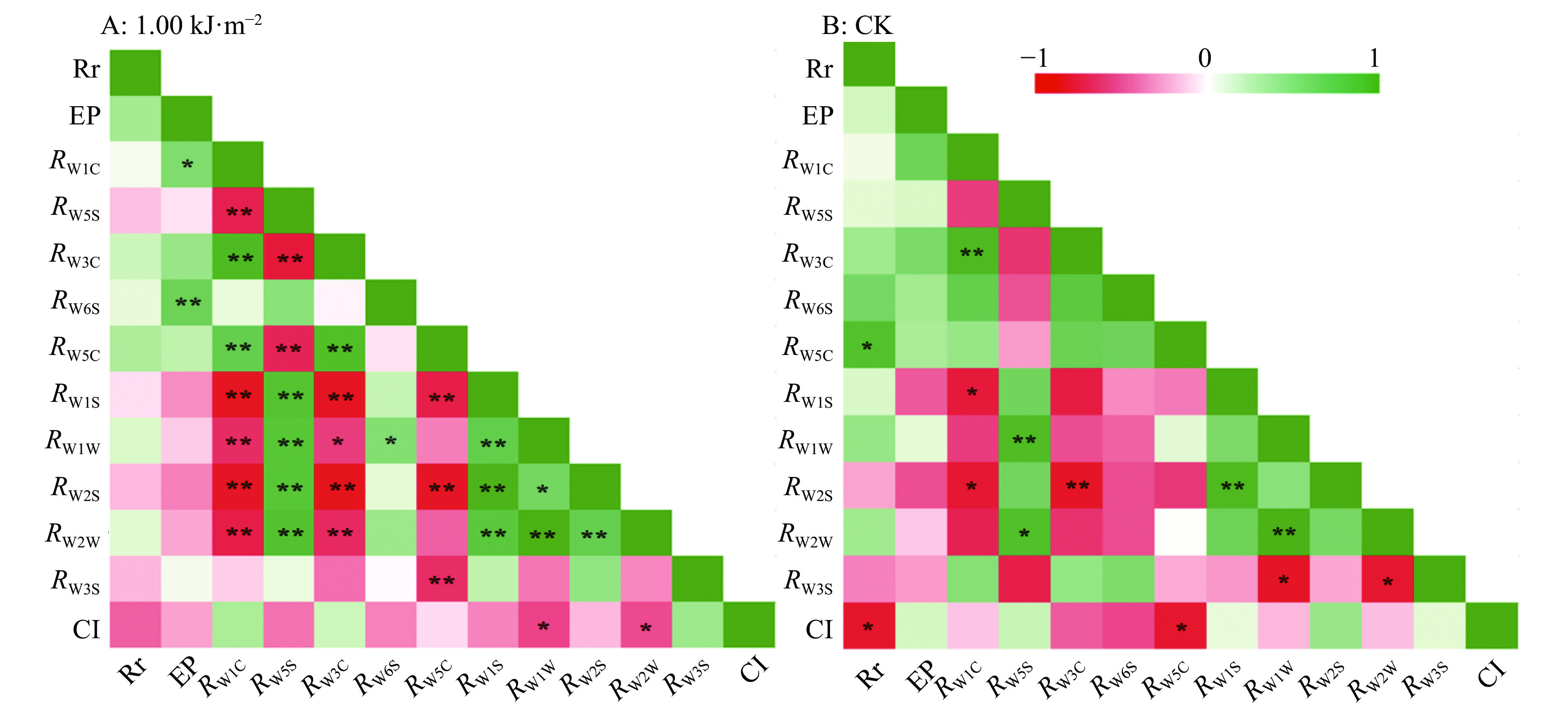 图 11 1.00 kJ·m−2 UV-C和对照处理人参果在贮藏期间测量指标之间的相关性分析 Fig. 11 Analysis of correlation between the measurement data of pepino fruits from 1.00 kJ·m−2 UV-C and control treatments during storage Rr:呼吸强度;EP:乙烯释放量;CI:冷害指数;R:对应传感器的相对电阻率;“*”和“**”分别表示在0.05和0.01水平显著相关 Rr: Respiration intensity; EP: Ethylene production; CI: Chilling injury index; R: Relative resistance of the corresponding sensor; “*”and“**”indicate significant correlation at 0.05 and 0.01 levels respectively |