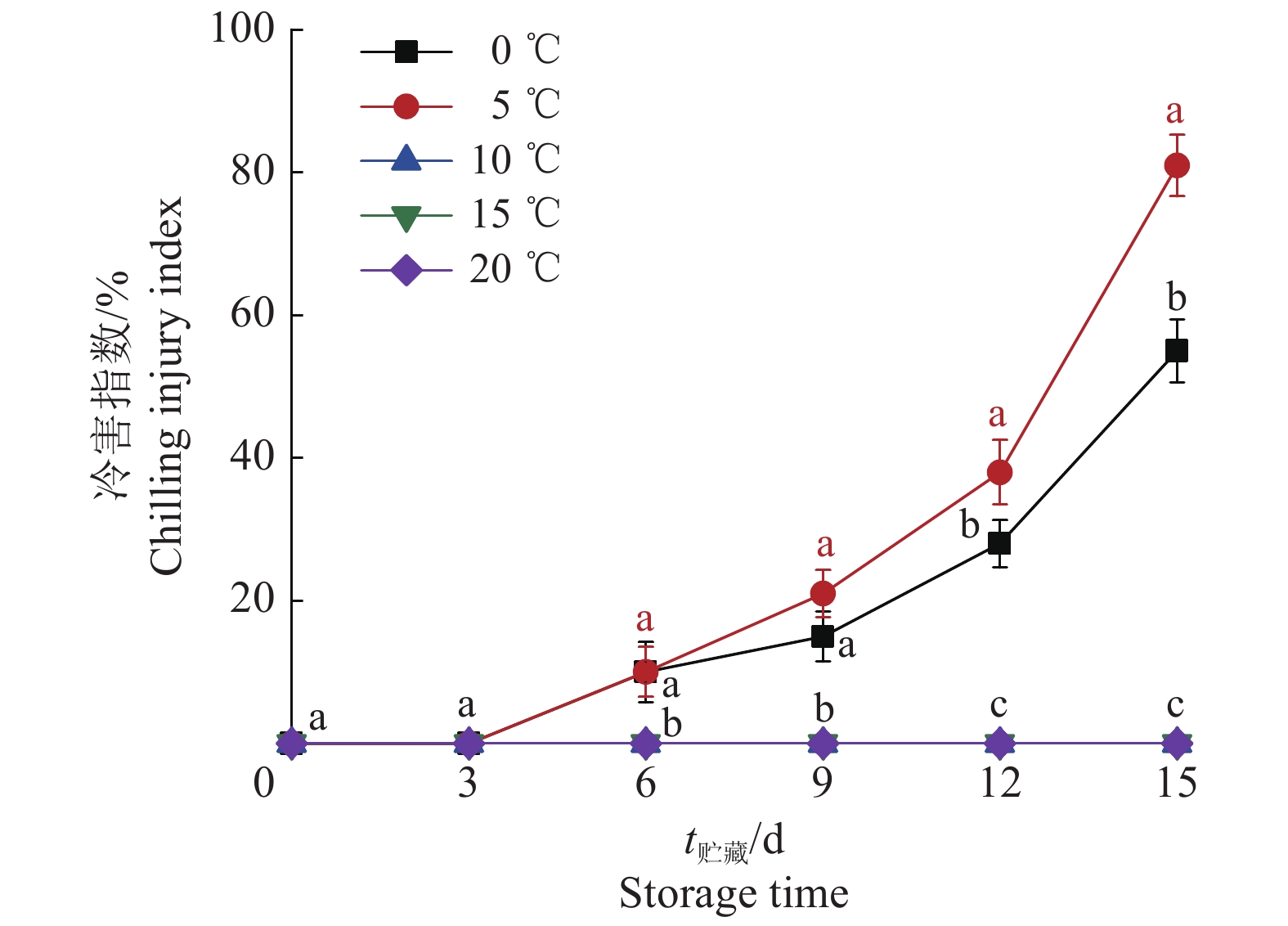 2 结果与分析 2.1 不同贮藏温度对人参果冷害及风味品质的影响 2.1.1 不同贮藏温度对人参果冷害指数的影响人参果在低温下贮藏易遭受冷害,冷害最直观的症状是果皮上出现褐斑[11]。由图2可知,10、15和20 ℃的贮藏条件下,人参果贮藏15 d无冷害发生。而在0和5 ℃贮藏条件下,在贮藏第6天均观察到明显的冷害症状,随着贮藏时间的延长,冷害指数逐渐升高。而且5 ℃条件下人参果的冷害指数在贮藏第9~15天高于0 ℃处理组,在贮藏第15天,5 ℃条件下人参果冷害指数为81%,较0 ℃处理组高26% (P<0.05),因此人参果在5 ℃的贮藏条件下易发生冷害,且冷害发展最为迅速。