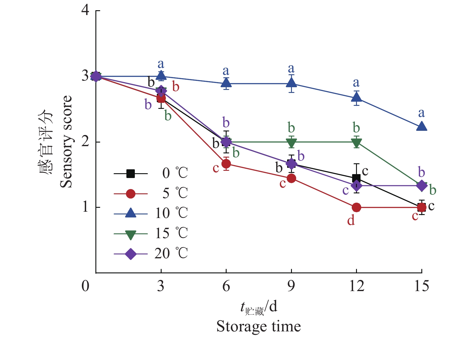 图 3 不同温度下贮藏的人参果的感官评分 Fig. 3 Sensory scores of pepino fruits stored under different temperatures 相同时间的不同小写字母表示差异显著(P<0.05,LSD法) Different lowercase letters of the same time indicate significant differences(P<0.05, LSD method) |