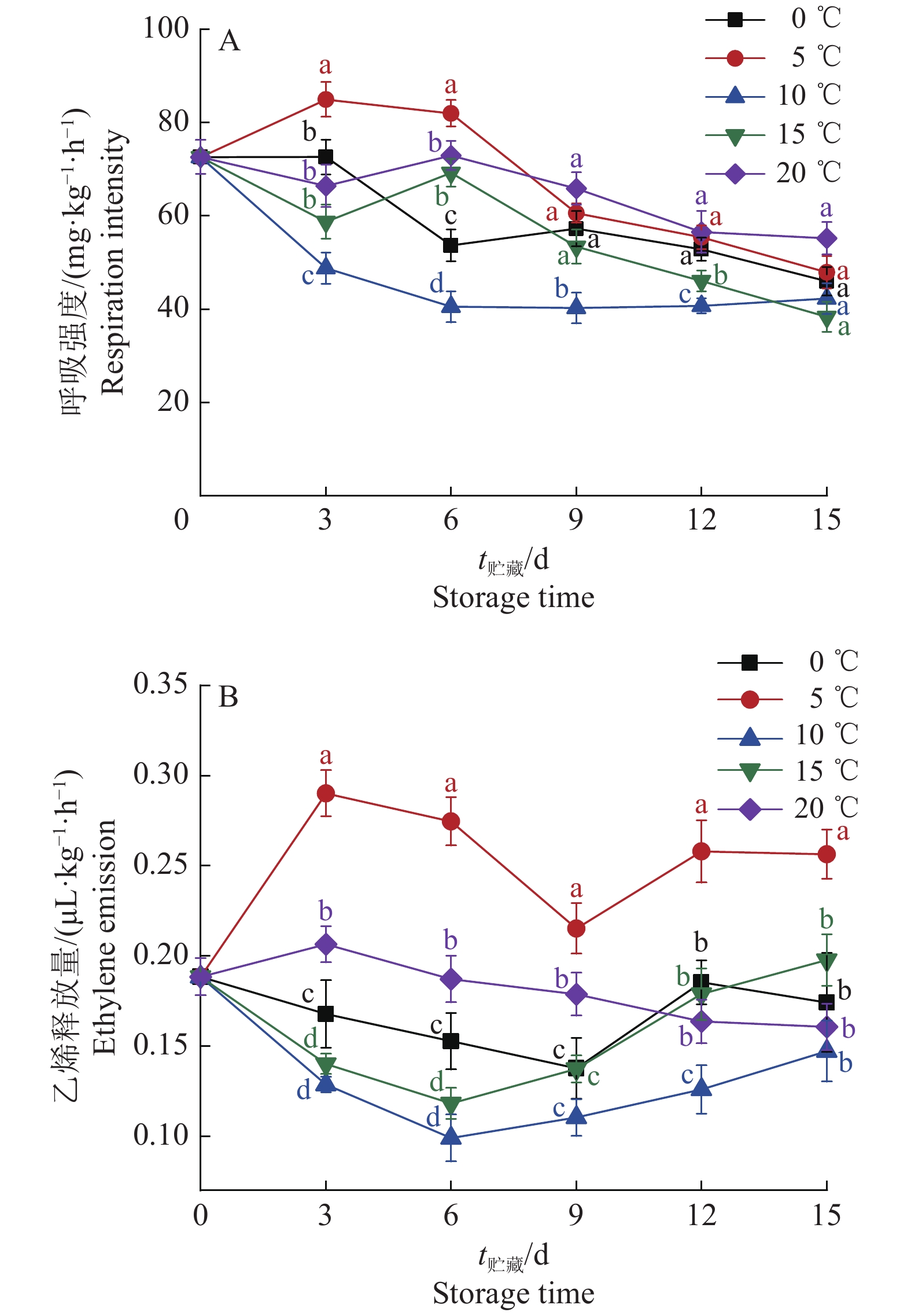 由图4A可知,随着贮藏时间的延长,人参果的呼吸强度总体呈先升高后下降的趋势。在0和5 ℃贮藏的第3天,呼吸强度达到峰值,且显著高于其他处理组(P<0.05),然后下降,这可能是与0和5 ℃贮藏的人参果遭受冷害有关。在15和20 ℃贮藏的第6天呼吸强度达到高峰,之后缓慢下降,但是在10 ℃贮藏的第6天开始平稳上升,且在贮藏期第3~12天显著低于其他处理组(P<0.05)。由图4B中可知,5 ℃贮藏的人参果的乙烯释放量变化趋势和呼吸强度大致相同,都呈先升高再下降的趋势,且显著高于其他处理组(P<0.05)。这说明人参果在冷害条件下产生乙烯,由于5 ℃下冷害现象高于0 ℃处理组,因此5 ℃条件下人参果乙烯释放量最高。此外,在20 ℃贮藏的第3天乙烯释放量达到了峰值后平稳下降,而15和10 ℃处理组先缓慢下降,从第6天开始平稳上升,且在10 ℃贮藏的人参果乙烯释放量保持在较低水平,这说明10~20 ℃条件下,低温可抑制人参果的成熟和衰老。综上所述,人参果在5 ℃贮藏条件下冷害的发生增强了呼吸强度,增加了乙烯释放量。