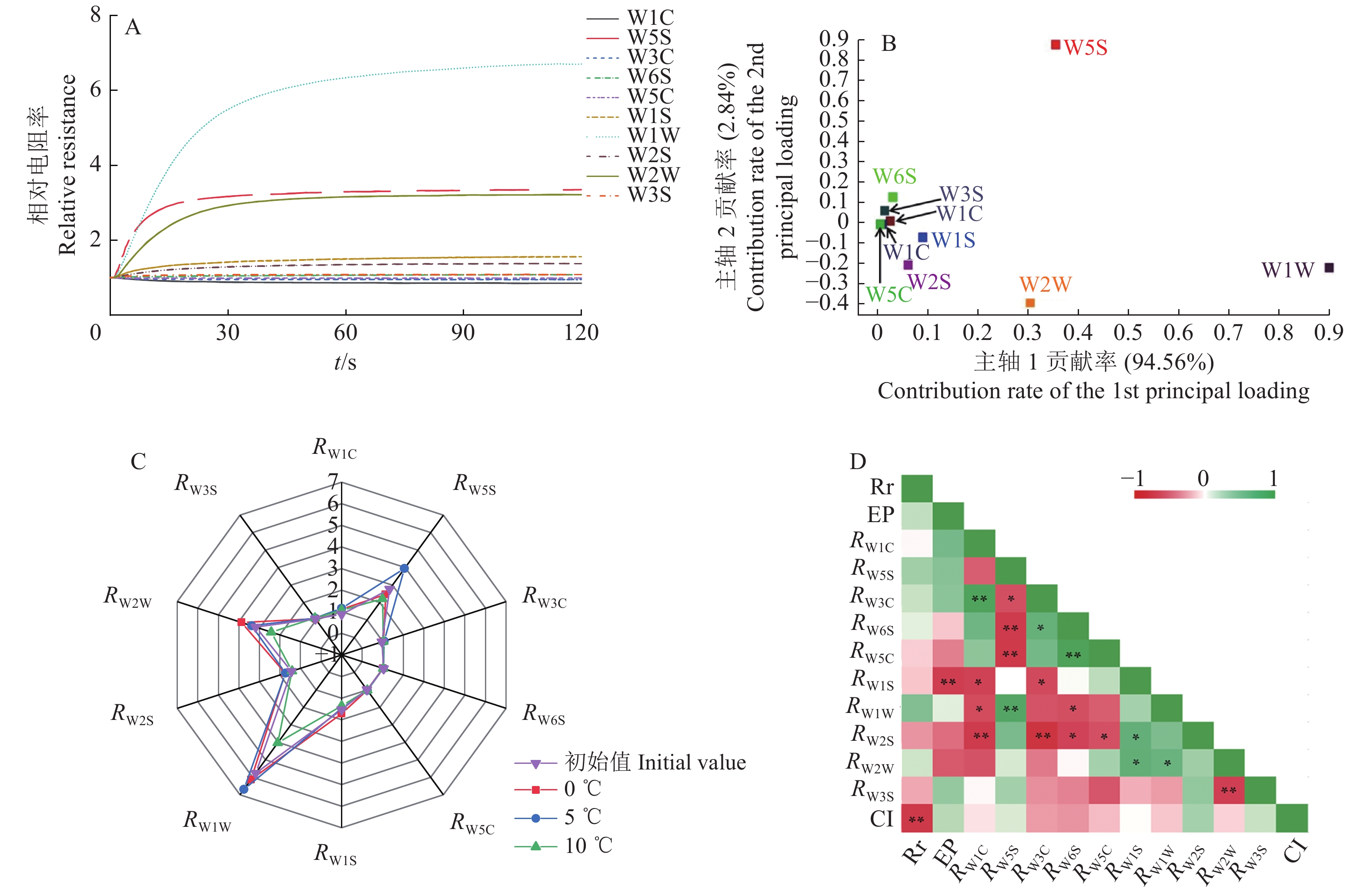 图 5 不同贮藏温度下的人参果电子鼻数据分析 Fig. 5 Analysis of electronic nose data for pepino fruits under different storage temperatures A:传感器对UV-C处理前人参果香气的响应图,B:传感器载荷分析,C:贮藏第15天传感器响应值的雷达图分析,D:相关性分析图;R:对应传感器的相对电阻率,Rr:呼吸强度,EP:乙烯释放量,CI:冷害指数;“*”和“**”分别表示在0.05和0.01水平显著相关 A: The sensor response graph of pepino fruits before UV-C treatment, B: Sensor load analysis, C: Radar graph of sensor response on the 15th day of storage, D: Correlation analysis diagram; R: Relative resistance of the corresponding sensor, Rr: Respiration intensity, EP: Ethylene production, CI: Chilling injury index; “*”and“**”indicate significant correlation at 0.05 and 0.01 levels respectively |