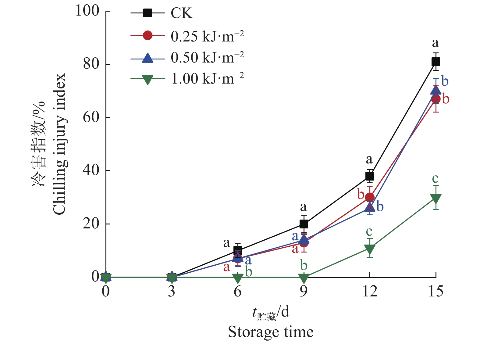 2.2 UV-C处理对人参果贮藏期冷害及风味品质的影响 2.2.1 UV-C处理对人参果贮藏期冷害指数的影响冷害指数是果实冷害程度和冷藏品质的直接表观统计[32]。由图6可知,0.25、0.50 kJ·m−2剂量的UV-C处理组和对照组均在贮藏第6天观察到明显的冷害症状,而1.00 kJ·m−2处理组在贮藏第12天出现明显的冷害症状,且冷害指数显著低于其他处理组(P<0.05)。贮藏至第15天时,1.00、0.50和0.25 kJ·m−2处理组的冷害指数分别为30%、70%、67%,均显著低于对照组(81%)(P<0.05)。这说明,与对照组相比,不同剂量的UV-C处理均能有效缓解人参果冷害,其中1.00 kJ·m−2 UV-C处理可将冷害发生时间推迟6 d。
