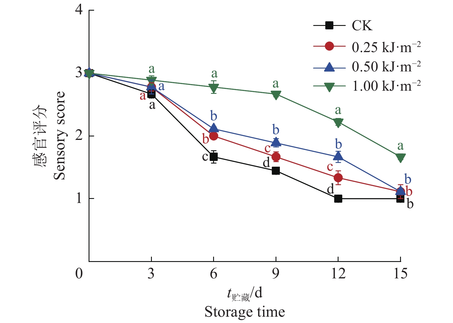 图 7 不同剂量UV-C处理后的人参果的感官评分 Fig. 7 Sensory scores of pepino fruits treated by different doses of UV-C 相同时间的不同小写字母表示差异显著(P<0.05,LSD法) Different lowercase letters of the same time indicate significant differences(P<0.05, LSD method) |