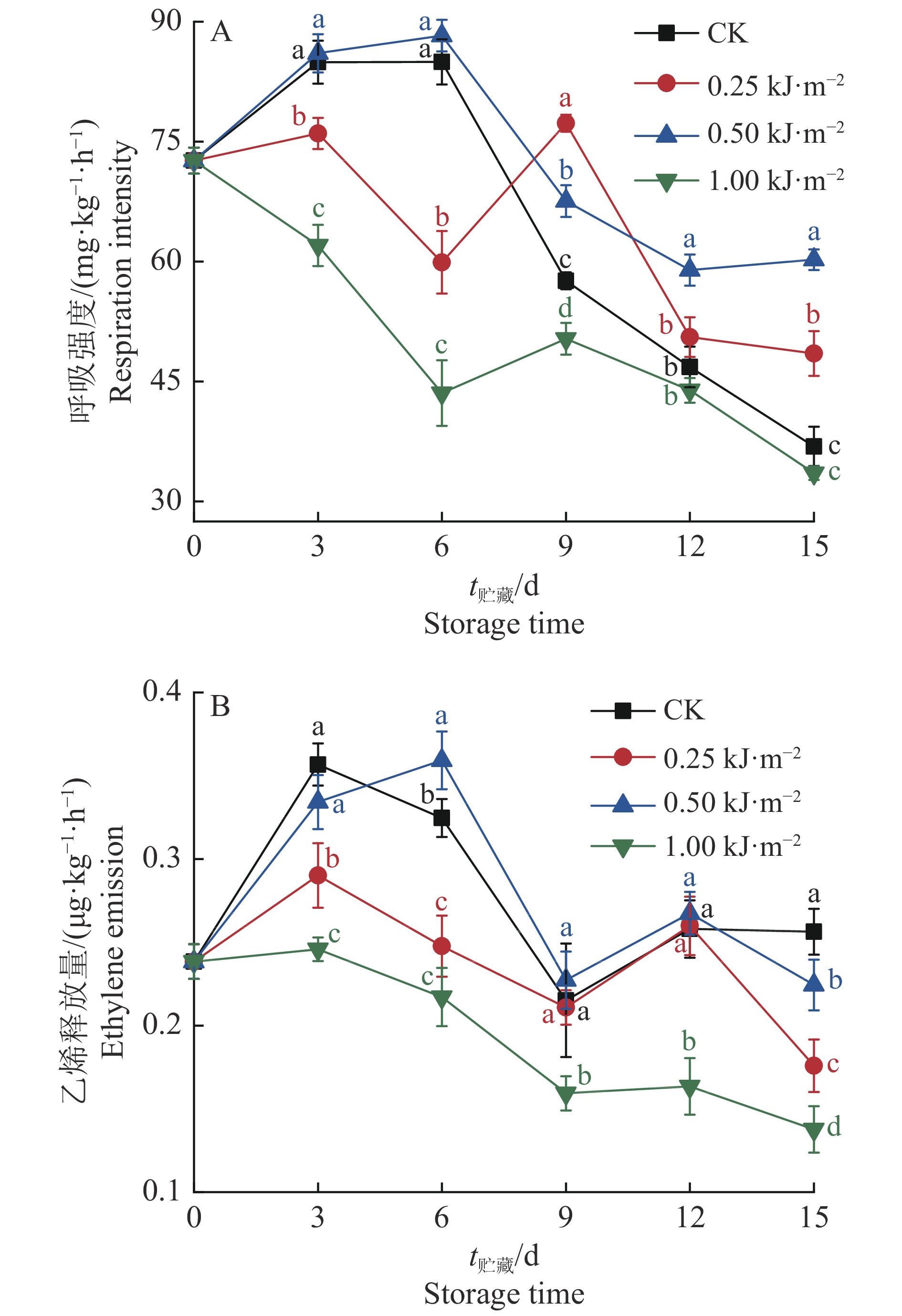 图 8 不同剂量UV-C处理后的人参果的呼吸强度和乙烯释放量 Fig. 8 Respiration intensities and ethylene emission of pepino fruits treated by different doses of UV-C 相同时间的不同小写字母表示差异显著(P<0.05,LSD法) Different lowercase letters of the same time indicate significant differences(P<0.05, LSD method) |