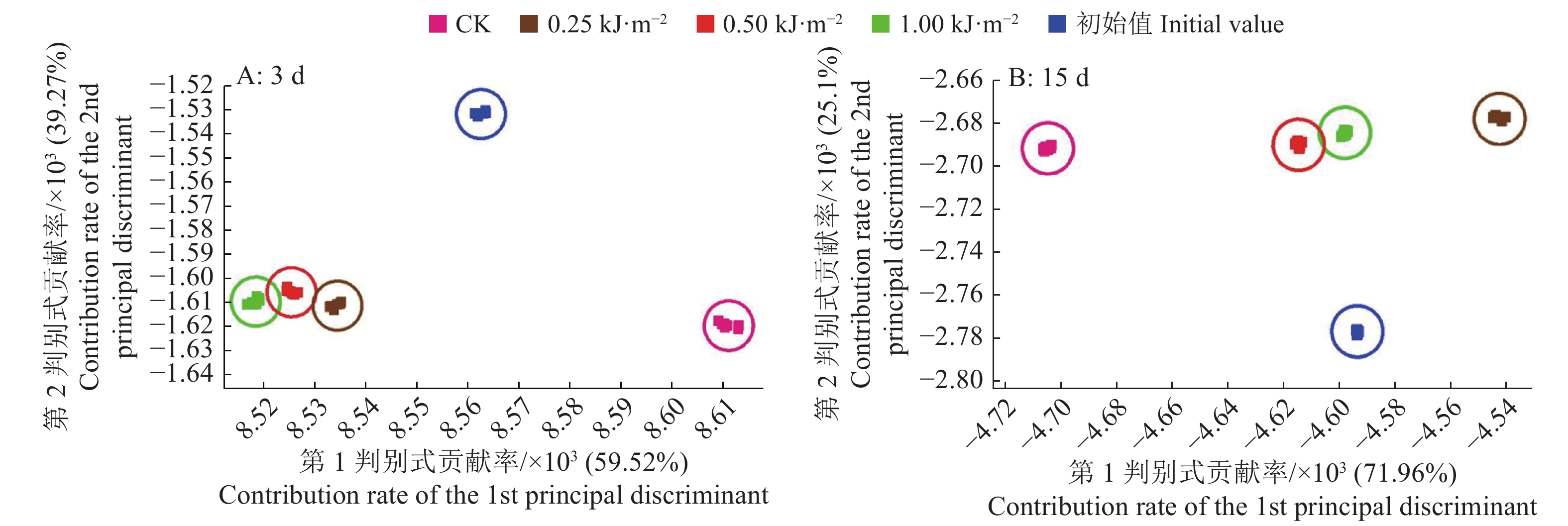 图 9 不同剂量UV-C处理后人参果贮藏第3、15天的LDA分析 Fig. 9 LDA analysis on pepino fruits stored for 3 and 15 days after UV-C treatment at different doses |