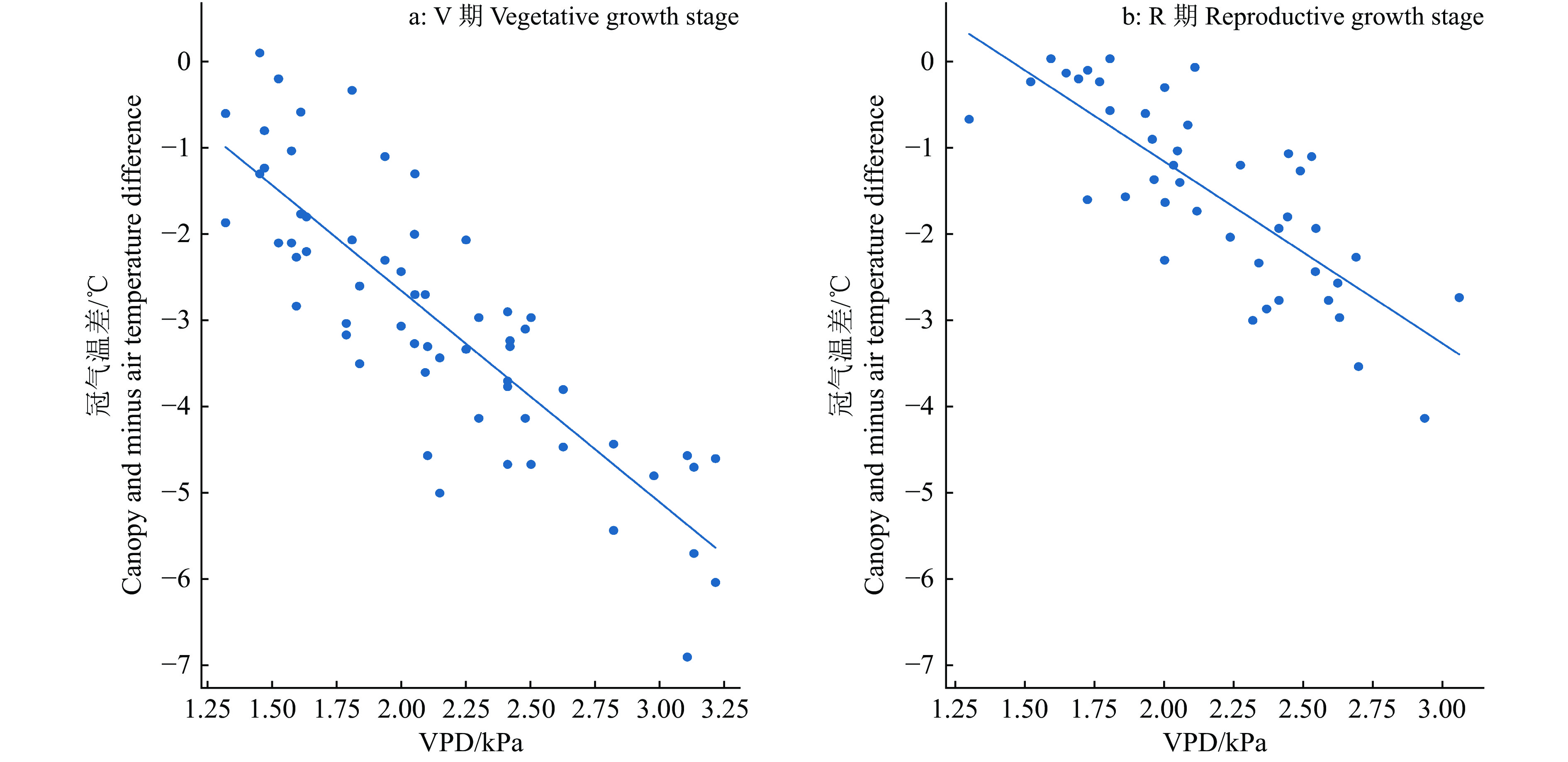 在无云晴天采集充分灌溉T1处理的冠层温度、空气温湿度数据,建立CWSI经验模型的冠气温差下限。图2a、2b分别为营养生长阶段(V期,11月27日—12月12日)生殖生长阶段(R期,12月21日—12月31日)的冠气温差与饱和水汽压差的散点图,通过回归方程拟合得到冠气温差的下限方程,方程如下所示: