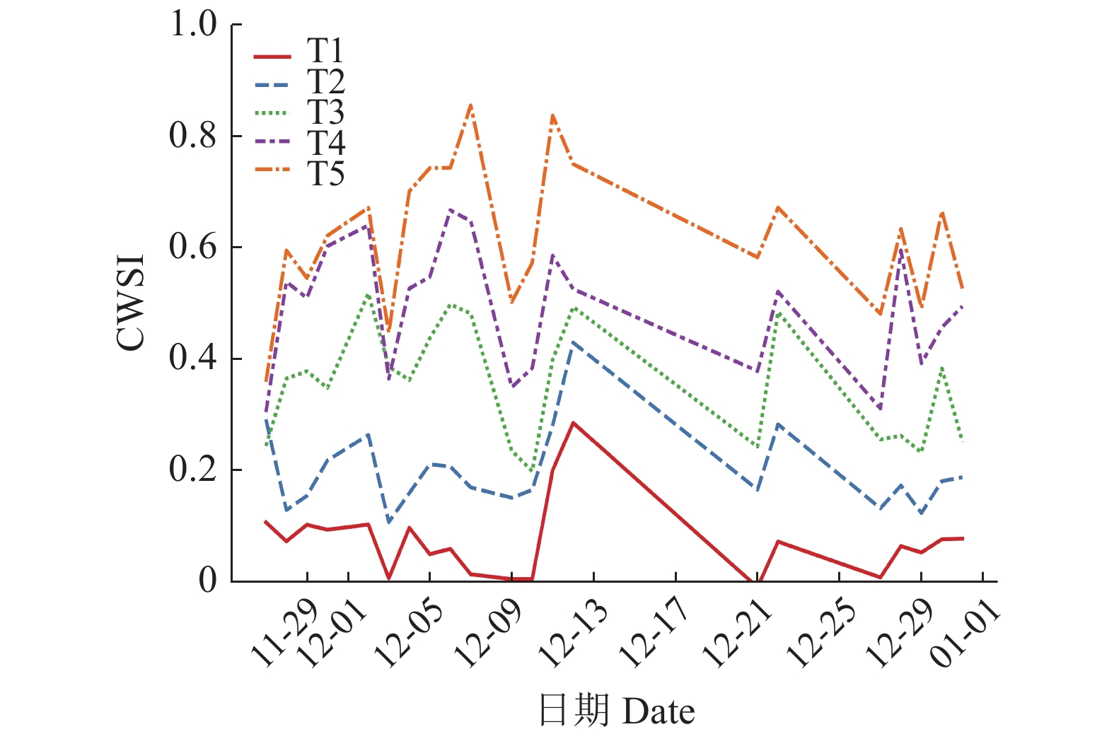 图 3 5种田间持水量处理的水分胁迫指数(CWSI)变化曲线 Fig. 3 Crop water stress index(CWSI) change curves under five field water holding capacities T1:田间持水量为32.2%;T2~T5:田间持水量分别为T1的85%、70%、55%和40% T1:Field water holding capacity was 32.2%;T2~T5: Field water holding capacity was 85%, 70%, 55% and 40% of T1 respectively |
