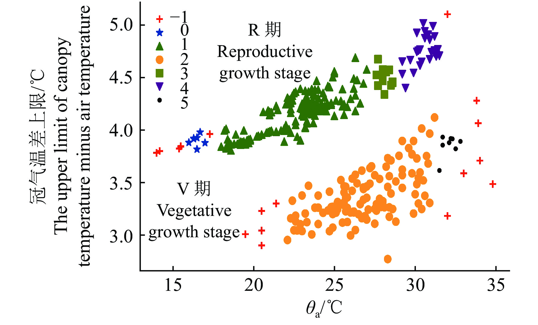 根据公式(3)获取的冠气温差上限及对应的空气温度,运用DBSCAN算法对油青菜心进行聚类,结果如图4所示。由图4可以看出,随着空气温度上升,2个时期的油青菜心冠气温差上限均呈现上升的趋势,其中R期的冠气温差上限比V期高,主要分布在[4,5] ℃,V期的冠气温差主要分布在[3,4] ℃。由于试验期间空气温度变化较大,算法自动聚类的簇共有6个,且R期的空气温度变化比V期更大,因此R期有4个簇,V期有2个簇,表明空气温度对DBSCAN的聚类效果影响较大。跨度越大则簇越多,增加了选取固定值的难度。数据集主要分布在[20,30] ℃,随着数据的稠密程度上升,簇内包含的数据增多,其中2个大簇的质心分别为3.4 ℃(类别为2,116)和4.2 ℃(类别为1,164),分别对应V期和R期。此外,聚类结果显示有小部分噪声点(类别为−1,是离群点),大多分布在空气温度区间边缘,剔除该部分数据并不影响聚类的效果。