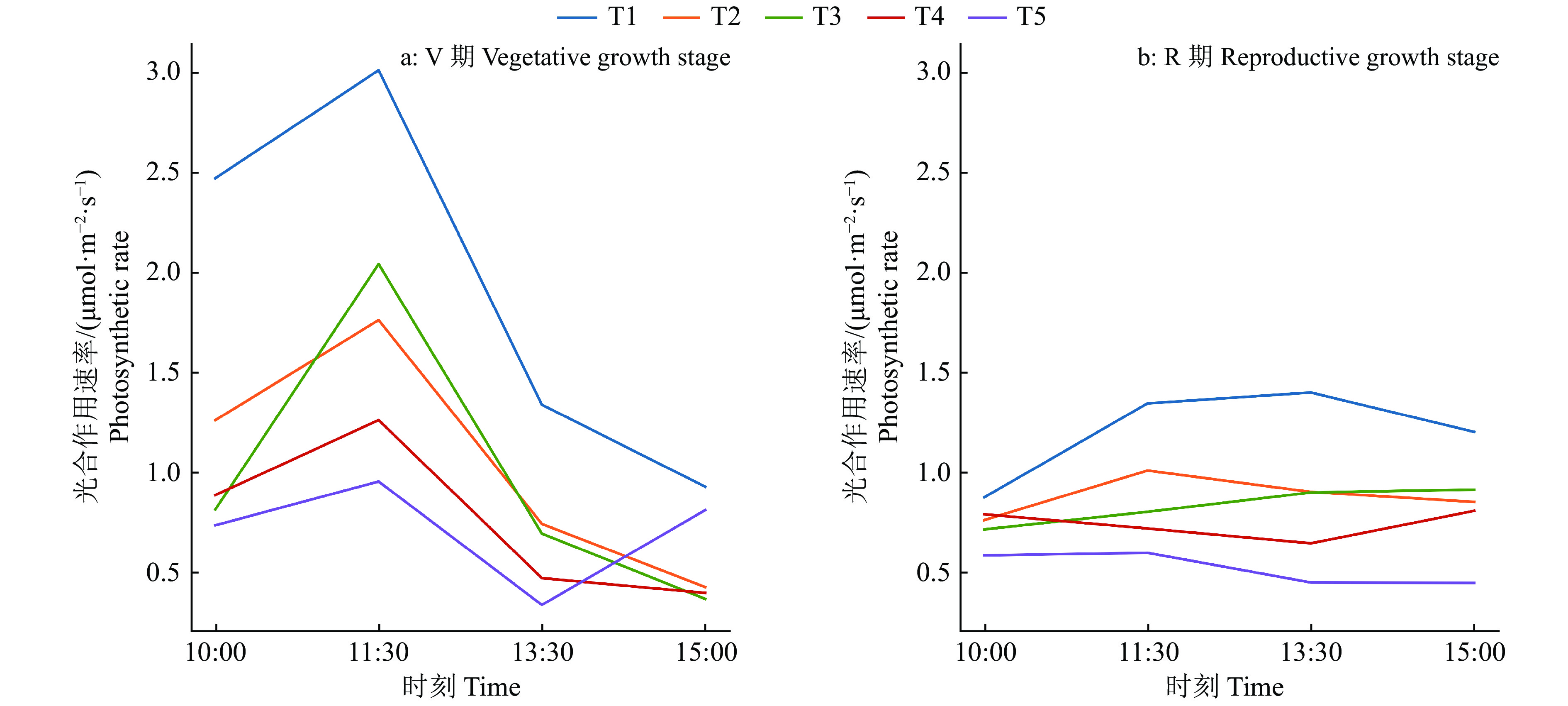为研究油青菜心CWSI与光合作用速率的关系,绘制了光合作用速率的日变化曲线(图5)。由图5可以看出,光合作用速率呈现先增加而后减少的变化趋势,这是由于11:30时左右的太阳辐射较强、温度较高,有利于作物进行光合作用。在V期11:30时以后光合作用速率的下降趋势较明显,通过基于LSD法的多重比较分析,各个时刻的光合速率平均值差异均达0.05的显著水平,在R期光合作用速率的下降趋势较平缓。在V期、R期中,CWSI与光合作用速率是负相关的关系,充分灌溉处理T1的光合作用速率最高,当水分胁迫程度加深时,菜心叶面温度上升,光合作用速率下降,不同水分胁迫处理的光合作用速率在0.05水平具有显著差异(LSD法)。在V期,11:30时5组水分胁迫处理的光合作用速率差距最大,在15:00时差距最小。