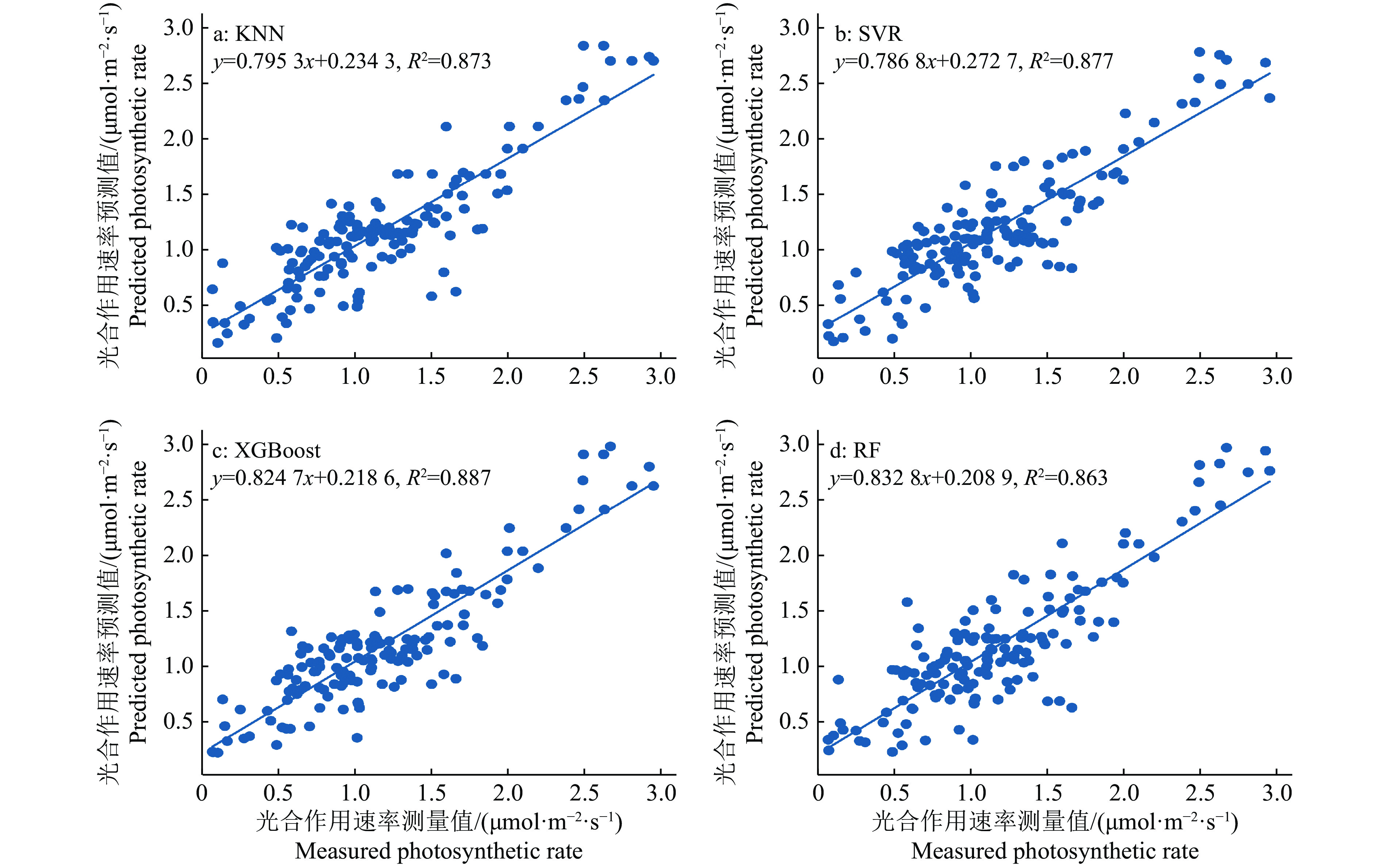 由图6和表2可以看出,XGBoost模型的预测值与测量值的相关系数最高,其次是SVR、KNN和RF模型,4种预测模型的相关系数均大于0.85,拟合方程的截距及斜率均没有显著差异,表明这4种机器学习均可以预测油青菜心的光合作用速率。由于光合作用速率的整个数据集分布并不均匀,随机划分的测试集在各区间的分布与整个数据集基本一致,主要集中在[0.5,1.5],当光合速率>2时预测值均偏大,表明原始数据的分布对这4种模型的预测效果有一定影响。集成学习方法XGBoost、RF在建模时往往需要规模大的数据集,本试验用于预测的数据集共有498组输入向量,XGBoost、RF的预测结果容易出现欠拟合的情况,无法体现提升树的优势。当数据集为原来的三分之一时,预测精度均下降,4种模型建模的相关系数分别为0.836(KNN)、0.868(SVR)、0.871(XGBoost)、0.837(RF),下降幅度最大的是KNN和RF,表明SVR在小样本回归中比RF、KNN表现好。当数据集较小时,SVR和XGBoost均可通过调整参数提高预测效果,如SVR减少惩罚系数和松弛变量,XGBoost提高学习速率、降低最大生成树的数目,但KNN和RF并没有显著提高。XGBoost和RF都属于集成学习,但XGBoost使用了一阶导数和二阶导数,使得预测值与实测值的拟合残差减少,又借鉴了RF列抽样的做法,降低过拟合和减少计算,大大提升效率,因此预测效果最好。