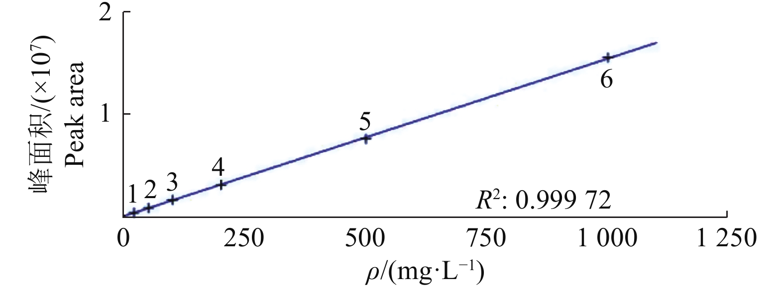 2 结果与分析 2.1 HPLC检测敌草隆的标准曲线用敌草隆标准品分别配置20、50、100、200、500、1000 mg/L的敌草隆样品,进行HPLC检测,以峰面积为纵坐标,添加水平为横坐标绘制标准曲线,并进行线性回归分析,获得的标准曲线为:y=4.13×104x+1.81×105(R2=0.99)(图1),相对保留时间为5.658 min(图2)。
