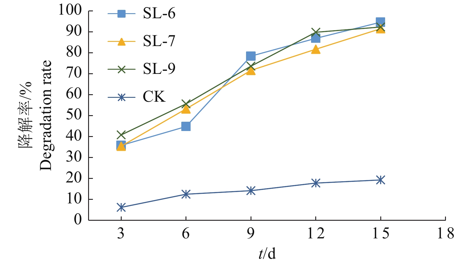 菌株SL-6、7、9对敌草隆的降解效果明显高于其余4株。且在第15天,降解率均高达90%以上(图3),因此选取该3株菌株开展后续试验。