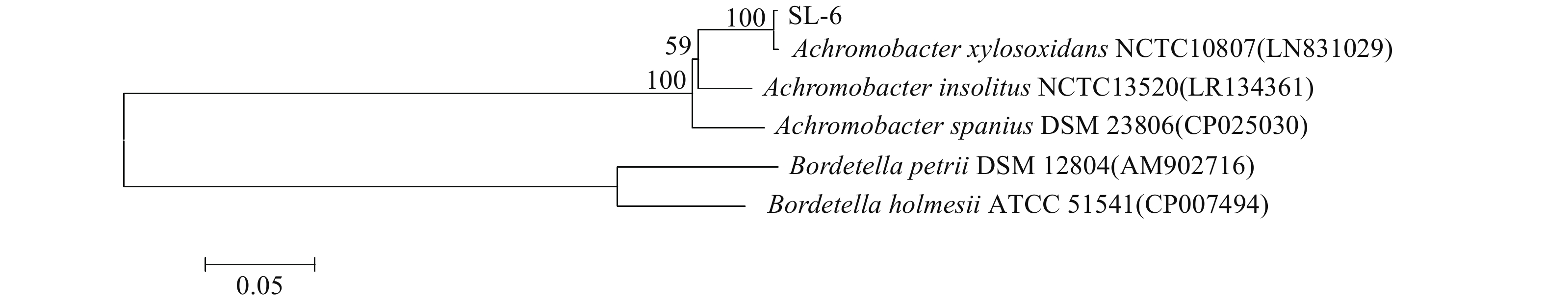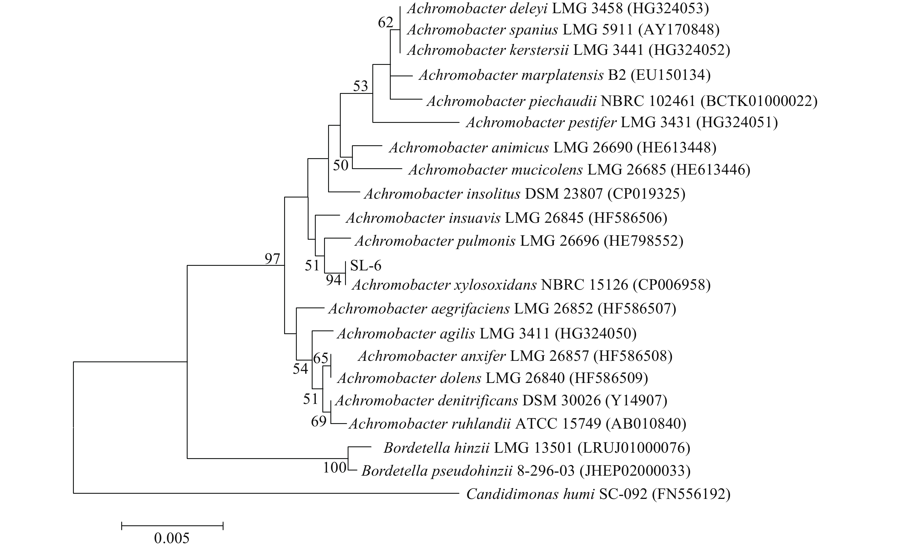 2.5.3 菌株SL-6与相关菌种的16S rDNA序列系统发育进化树采用临位连接法显示菌株SL-6与相关菌种的16S rDNA系统发育树,进行1000次的相似度重复计算,菌株SL-6与木糖氧化无色杆菌A. xylosoxidans的相似性最高,为100%。(图5)。