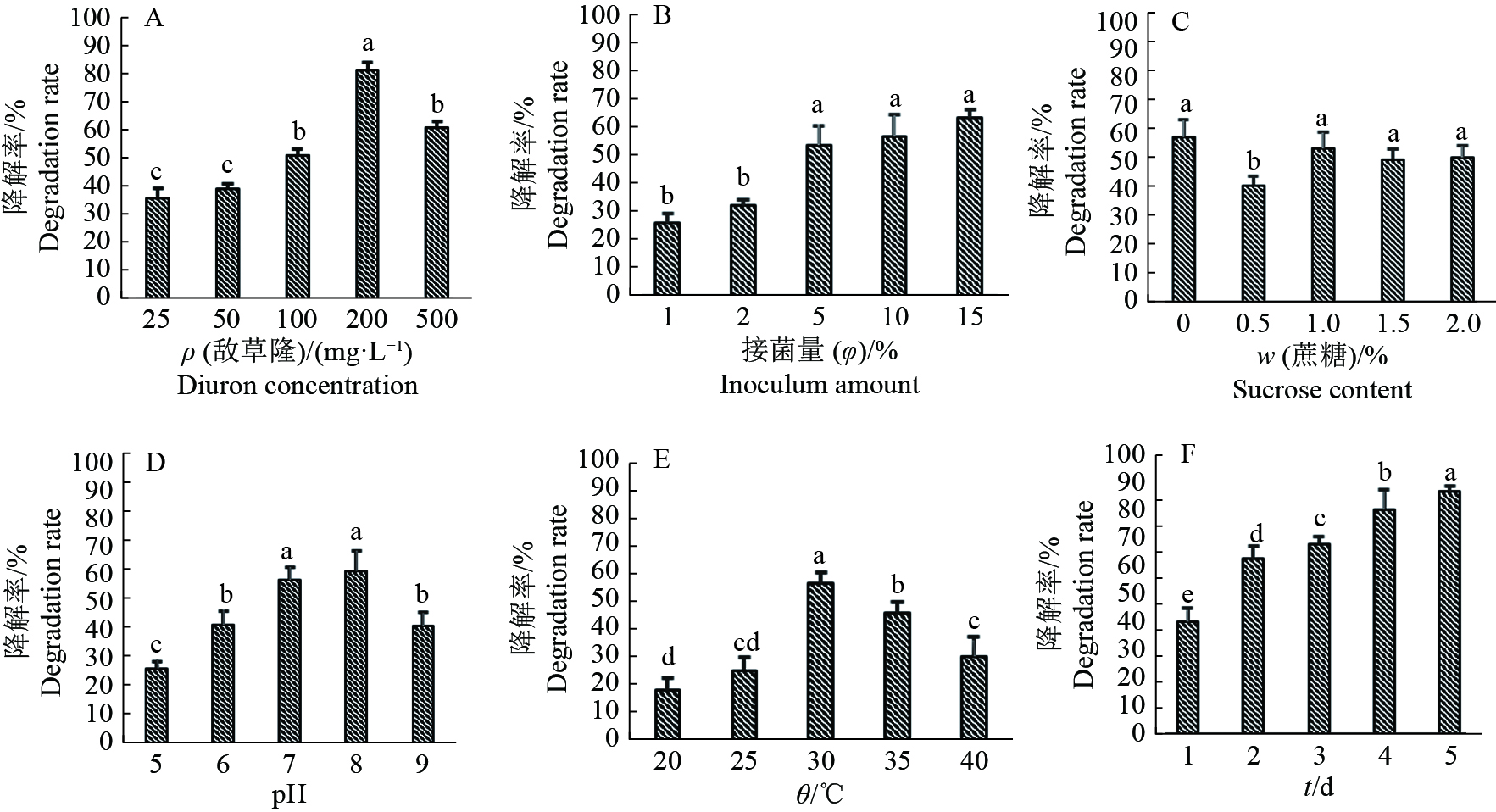 图 7 不同培养条件对菌株SL-6降解敌草隆的影响 Fig. 7 Effect of various cultural conditions on diuron degradation by strain SL-6 A:敌草隆初始质量浓度;B:接菌量;C:蔗糖含量;D:pH;E:温度;F:最优条件;图中数据为平均值和标准误(n=3);各图中,柱子上方的不同小写字母表示差异显著(P < 0.05,Duncan’s法) A: Initial concentration of diuron; B: Inoculation amount; C:Sucrose content; D: pH; E: Temperature; F: Optimal conditions;Data in the figure are means and standard errors (n=3); In each graph, different lowercase letters on bars indicate significant differences(P < 0.05, Duncan’s method) |