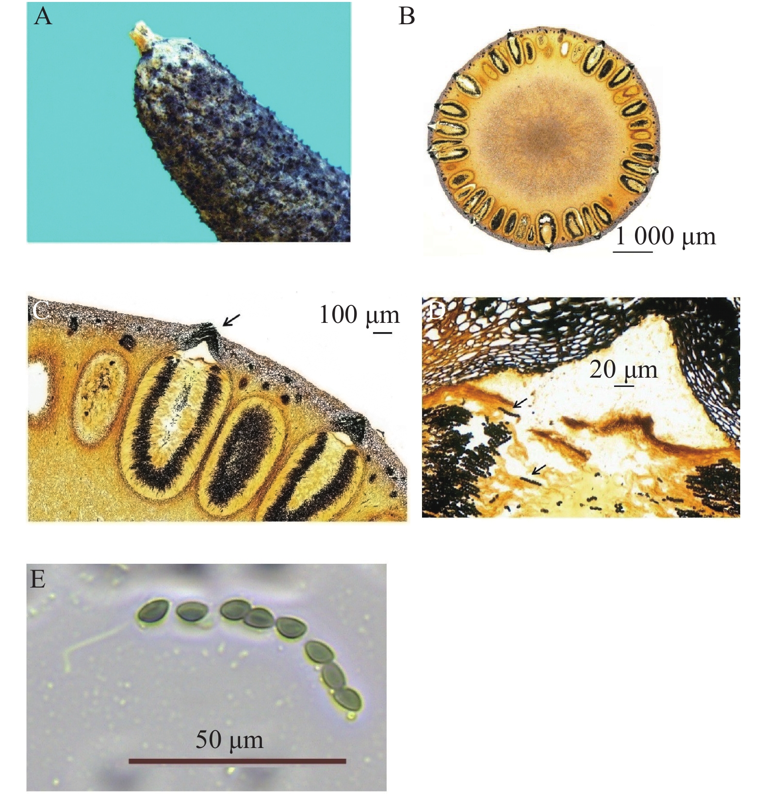 2 结果与分析 2.1 采集的炭角菌菌株子座形态特征对从浙江省诸暨市白蚁死亡巢穴上生长的子座进行形态鉴定。该子座单生直立,子座大、圆柱型,质地坚硬,底部有柄,细小黑色,中上部分粗大,颜色为黄色至黑灰色,表面有黑色凸起,顶部呈细长状(图1A)。子囊壳多个、椭圆形,埋生于子座内侧(图1B),孔口乳状凸起(图1C)。子囊圆柱形,具长柄(图1 D),内含8个子囊孢子,单列排列,子囊孢子椭圆形,不等边,6.0~6.5 μm×2.0~2.5 μm,较光滑(图1E)。上述形态特征与痂状炭角菌[4]相符。