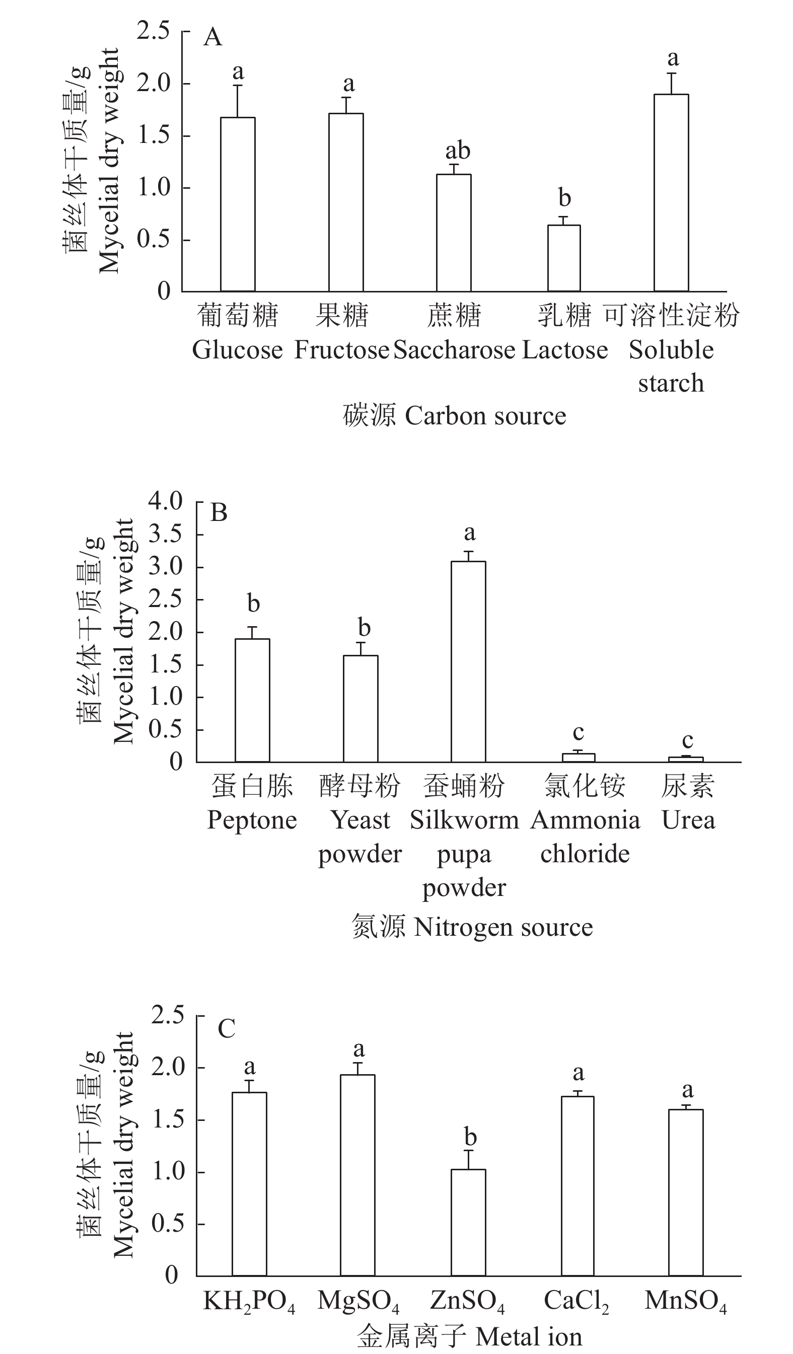 图 2 添加不同碳源、氮源、金属离子的菌丝体干质量 Fig. 2 Dry weight of mycelia with different carbon and nitrogen sources, and metal ions 各小图中柱子上的不同小写字母表示处理间差异显著(P<0.05,Duncan’s法) Different lowercase letters on the columns in each figure indicate significant differences among treatments (P<0.05, Duncan’s method) |