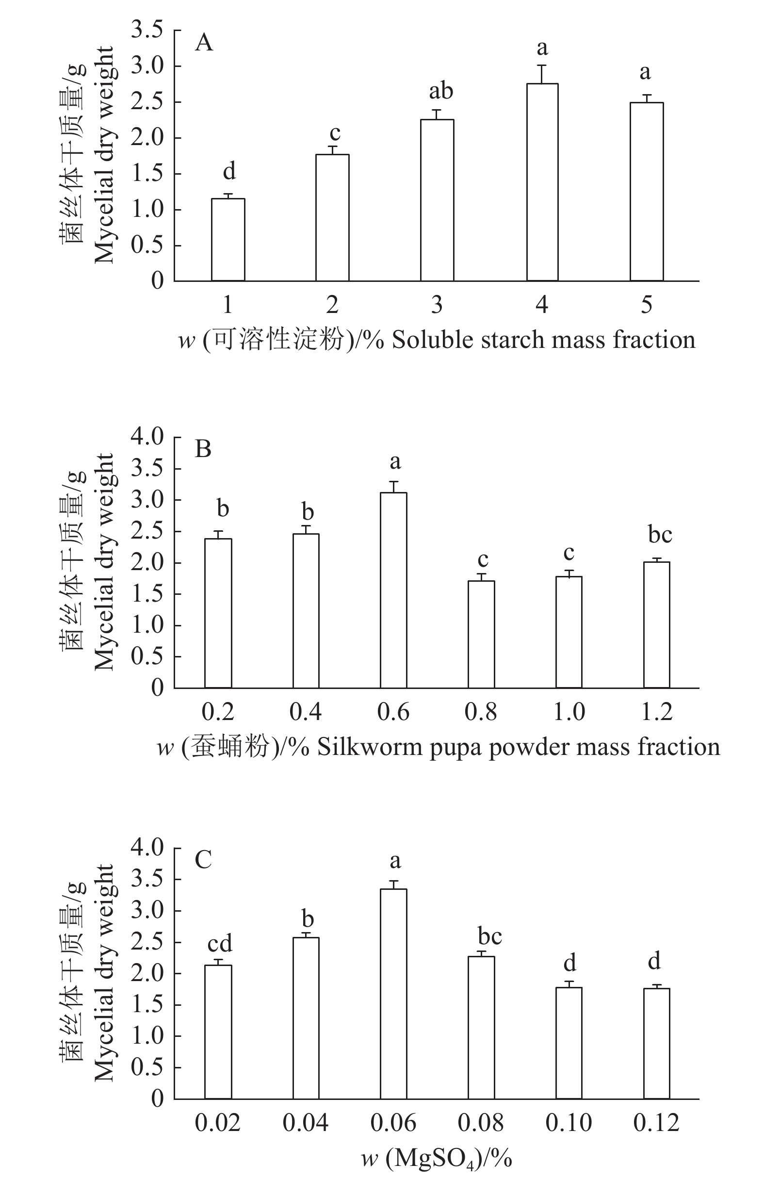 图 3 添加不同质量分数可溶性淀粉、蚕蛹粉和MgSO4的菌丝体干质量变化 Fig. 3 Dry weight of mycelia with different mass fractions of soluble starch, silkworm pupa powder and MgSO4 各小图中柱子上的不同小写字母表示处理间差异显著(P<0.05,Duncan’s法) Different lowercase letters on the columns in each figure indicate significant differences among treatments (P<0.05, Duncan’s method) |