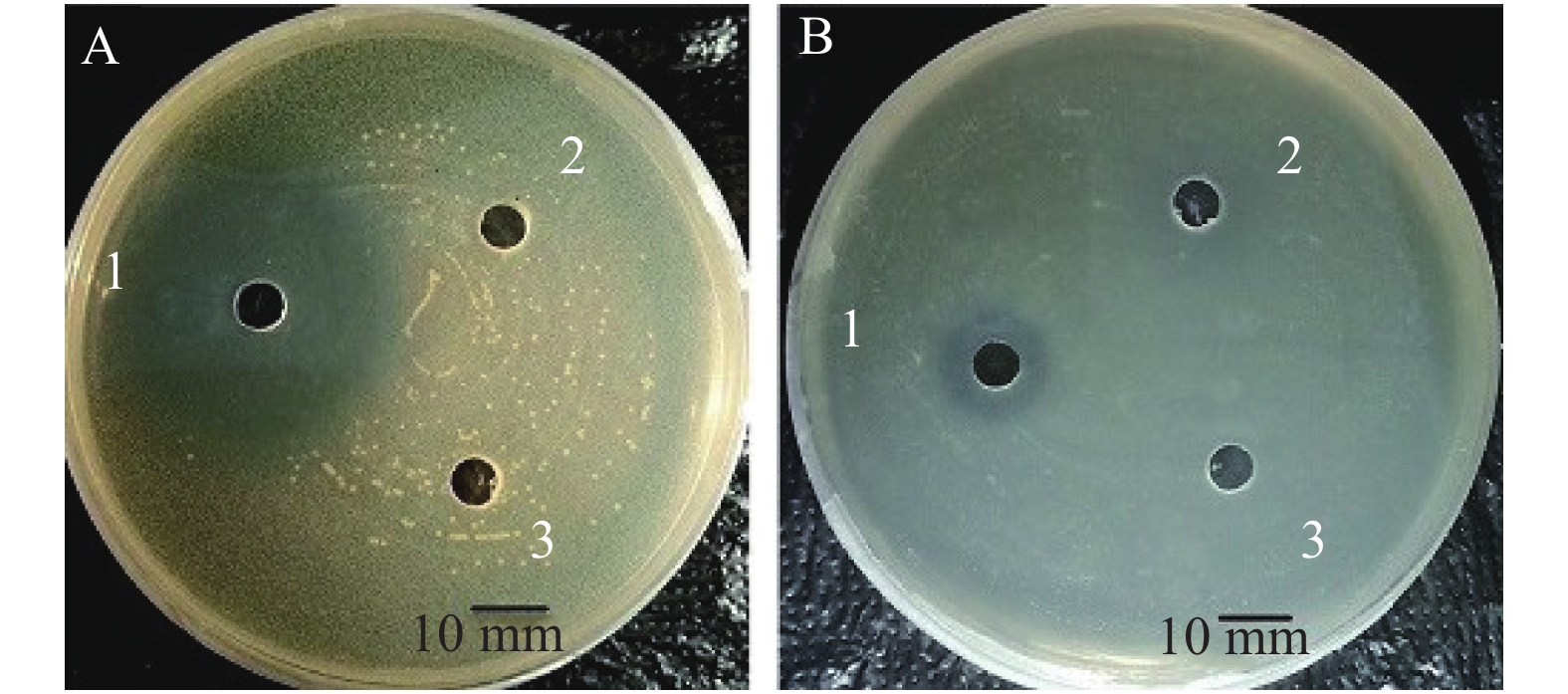 图 5 平板抑菌法测定痂状炭角菌液体发酵产物抗菌活性 Fig. 5 Antibacterial activity of liquid fermentation product of Xylaria escharoidea by plate bacteriostatic method A: 金黄色葡萄球菌, B: 大肠埃希菌; 1: 液体发酵液, 2: 山梨酸钾, 3: 水 A: Staphylococcus aureus, B: Escherichia coli; 1: Liquid fermentation product, 2: Potassium sorbate, 3: Water |