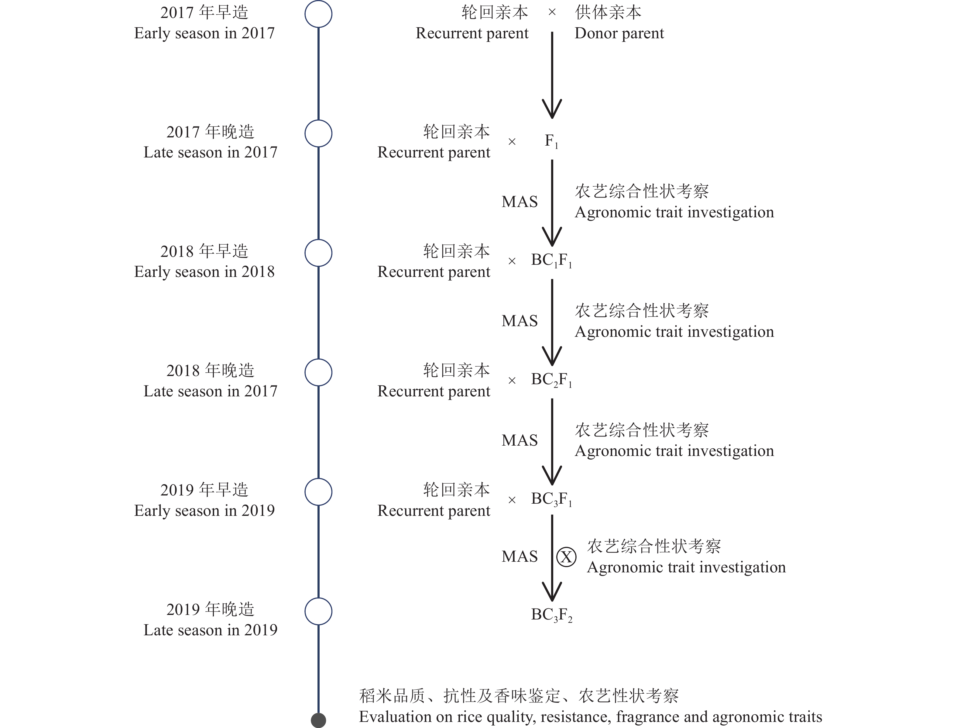 1 材料与方法 1.1 试验材料轮回亲本:保持系材料‘恒丰B’(广东省农科院水稻研究所利用‘黄壳香选’与保持系种质‘113B’杂交选育);保持系材料‘广8B’(广东省农科院水稻研究所由‘增城丝苗−8选’和‘1325B’杂交选育)。‘恒丰B’和‘广8B’稻米无香味;‘恒丰B’稻瘟病抗性表现为中抗,‘广8B’稻瘟病抗性为抗。