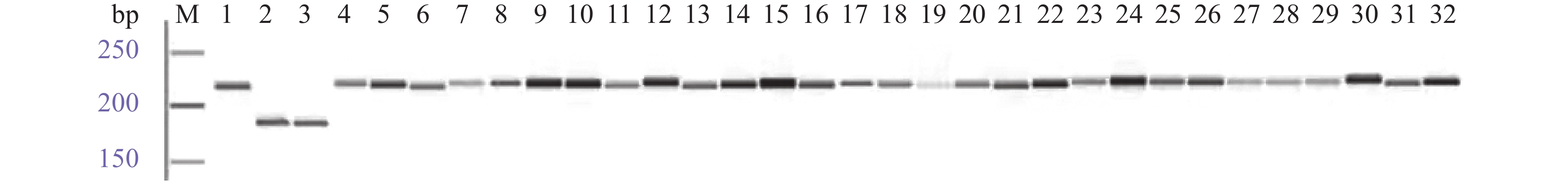 图 2 亲本和改良后代BC3F2株系Badh2基因分型毛细管电泳结果 Fig. 2 Genotyping of Badh2 of parents and the genetically-improved BC3F2 lines detected by capillary electrophoresis M:DNA 标记;1:‘B39’;2:‘恒丰B’;3:‘广8B’;4~17:‘恒丰B’改良BC3F2株系;18~32:‘广8B’改良BC3F2株系 M: DNA marker; 1: ‘B39’; 2: ‘Hengfeng B’; 3:‘Guang 8B’; 4−17: Improved BC3F2 lines from ‘Hengfeng B’; 18−32: Improved BC3F2 lines from ‘Guang 8B’ |