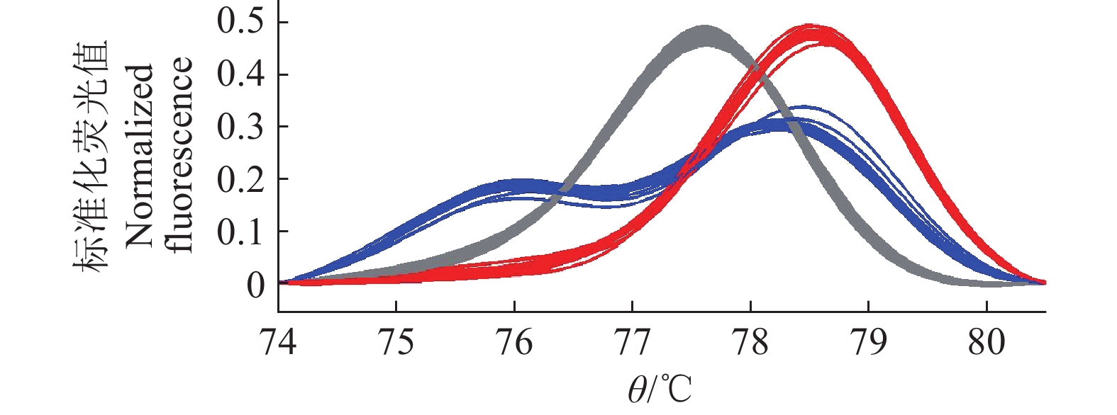 图 3 亲本和改良后代BC3F2株系Pita基因分型HRM分析结果 Fig. 3 HRM genotyping of Pita of parents and the genetically-improved BC3F2 lines 灰色曲线表示位点含纯合有利等位基因(‘B39’为此基因型);红色曲线表示位点不含抗性有利等位基因;蓝色曲线表示位点杂合 Grey lines represent the rice lines harboring elite homozygous allele(‘B39’has the genotype),red lines represent the rice lines not carrying the elite allele, and blue lines represent the rice lines harboring heterozygous alleles |