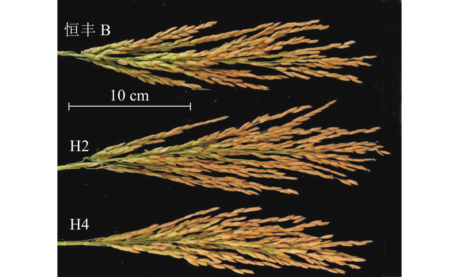 图 4 ‘恒丰B’及其后代改良株系H2和H4穗型对比 Fig. 4 Panicles of ‘Hengfeng B’ and its genetically improved line,H2 and H4 |