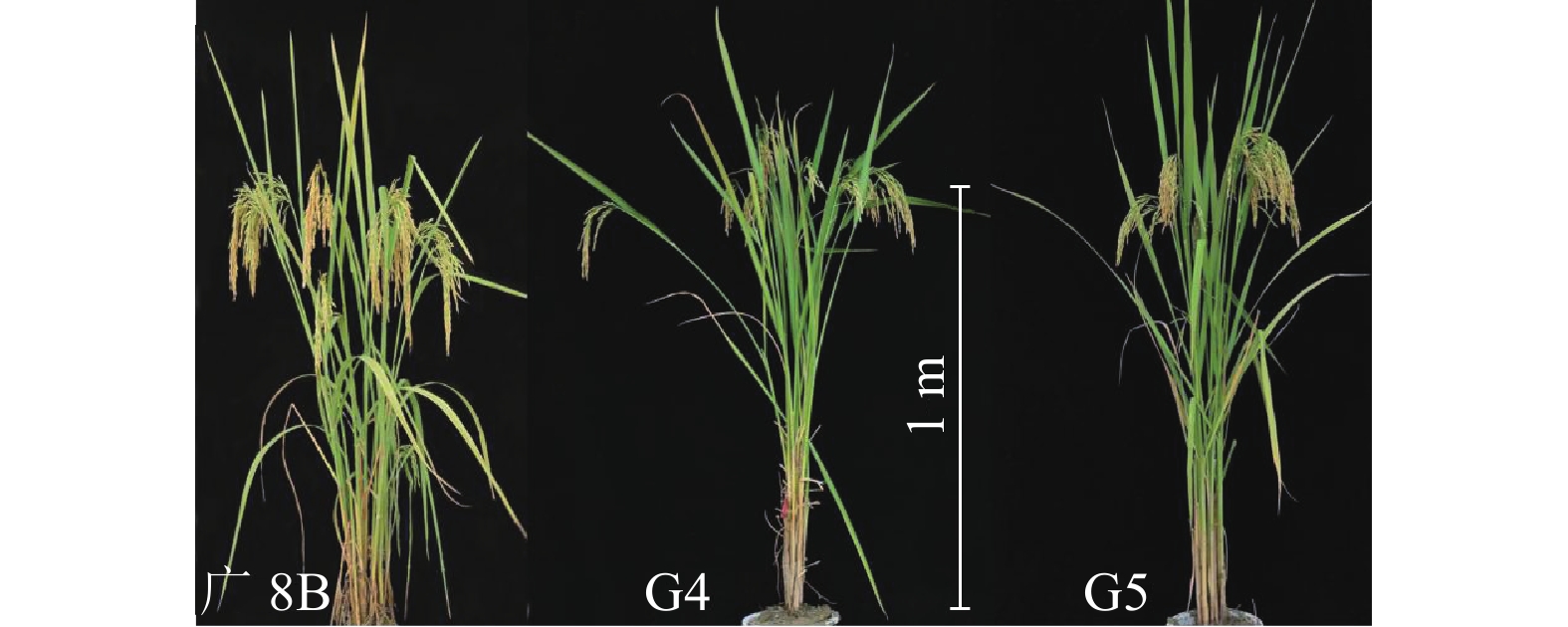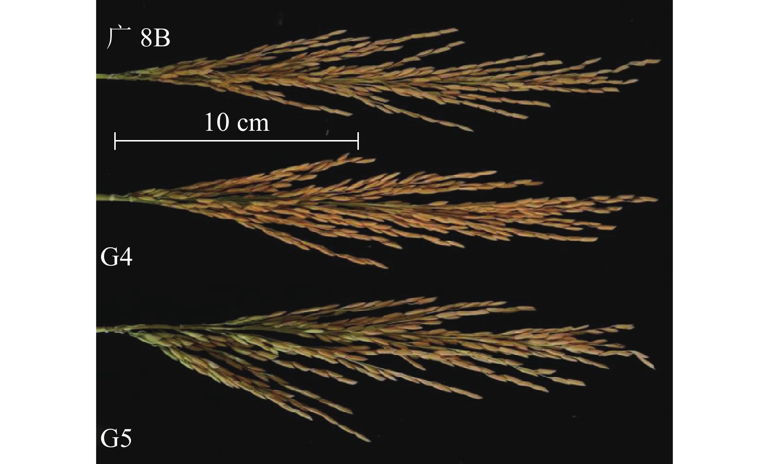 图 5 ‘广8B’及其后代改良株系G4和G5穗型对比 Fig. 5 Panicles of ‘Guang 8B’ and its genetically improved lines, G4 and G5 |