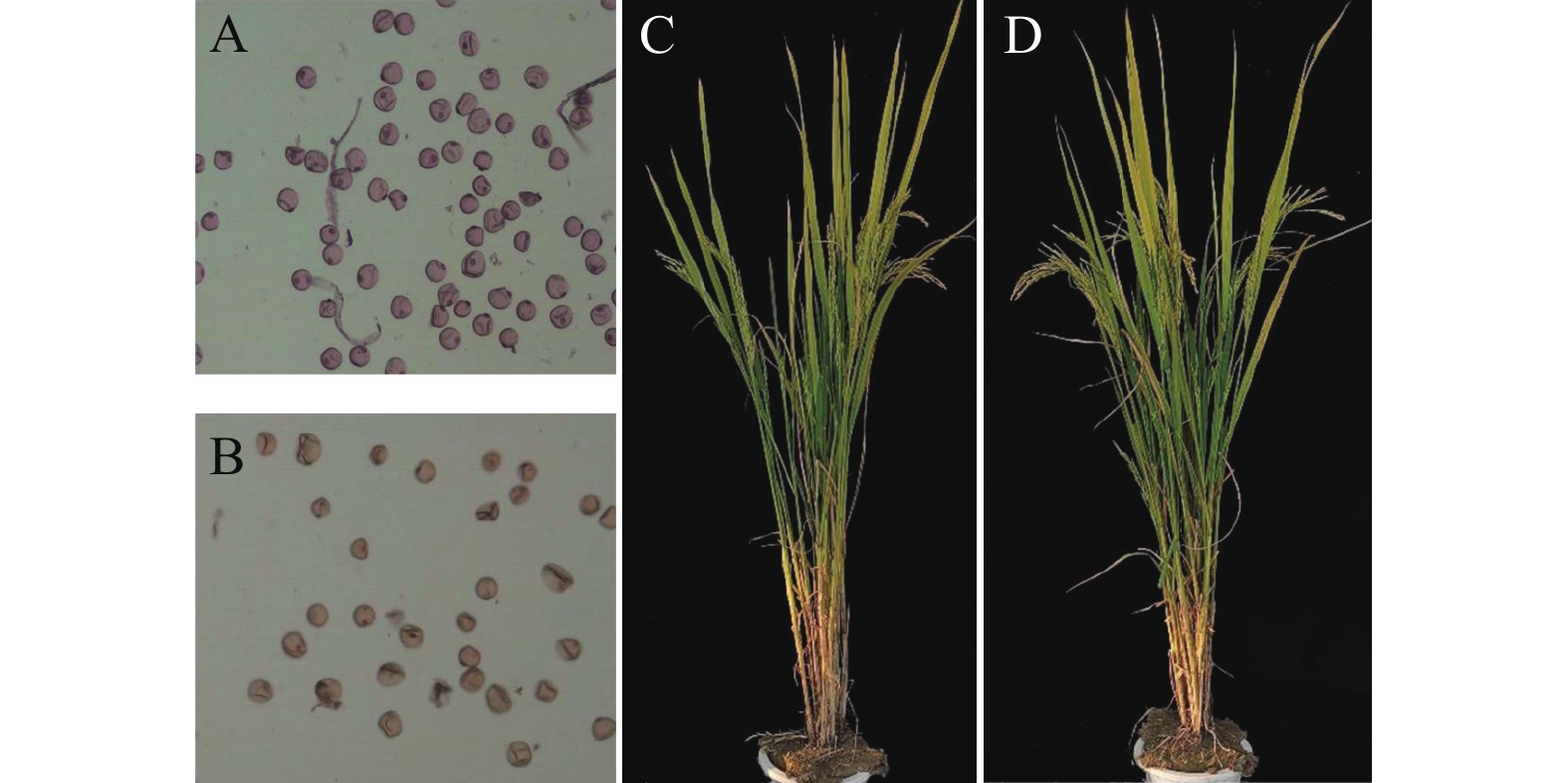 在2019年早造对‘恒丰B’和‘广8B’的BC3F1进行了单株测保检测。2019年晚造测保结果显示,23个BC3F1代材料对应的测保小区中,16个小区不育等级为全不育和高不育、4个小区为半不育等级,3个小区材料为正常可育等级。BC3F1测保材料中69.57%不育等级为全不育和高不育,17.39%为半不育,13.04%为正常可育,可育率达到30.43%。测保成功的株系花粉活力分析结果显示,花粉染色为典型败育类型(图8A、8B);测保不育株株型调查显示,不育株株型正常(图8C、8D)。