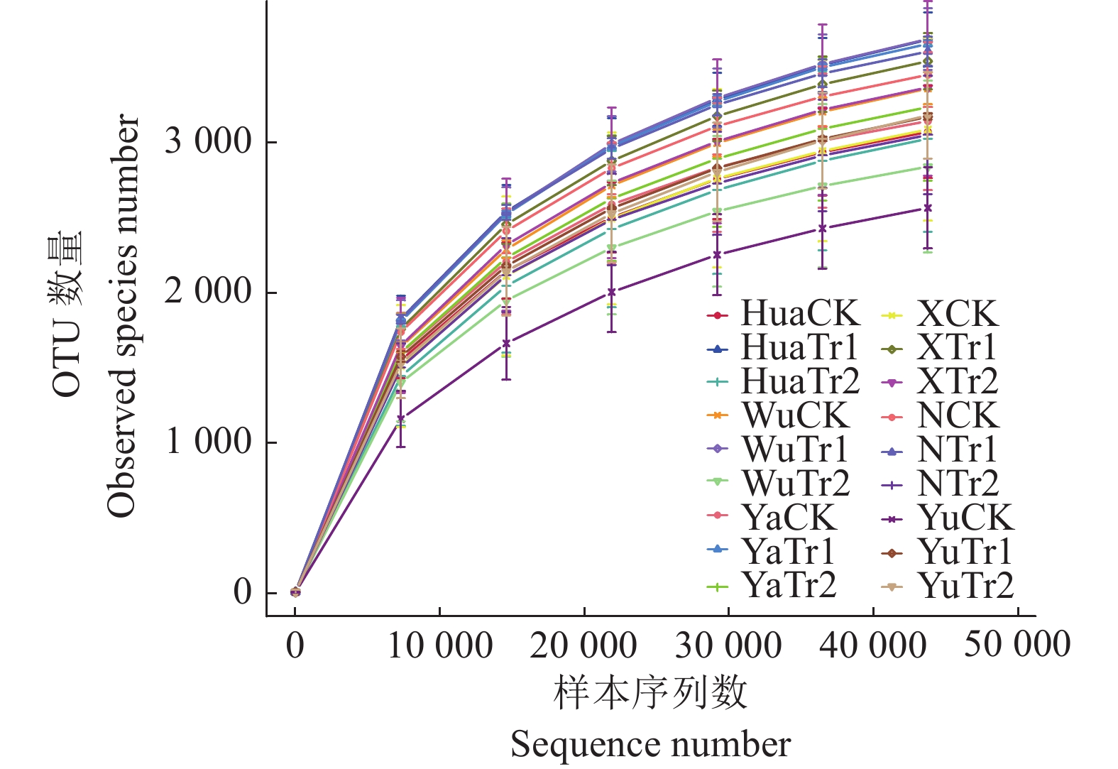 2 结果与分析 2.1 测序序列的质量控制通过对42个土壤样品细菌V3-V4区高通量测序,根据优化标准对所测序列去杂后,结果显示共获得3336672条Clean reads,平均读长大于414 bp,相似度为0.97的条件下,对土壤中细菌的覆盖率为97.9%~98.5%,由图1可知,所有样本OTU数量稀释曲线都急剧上升后趋向平坦,表示各样本高通量测序数据量渐近合理,能够较准确地反映土壤微生物的丰富度和多样性。