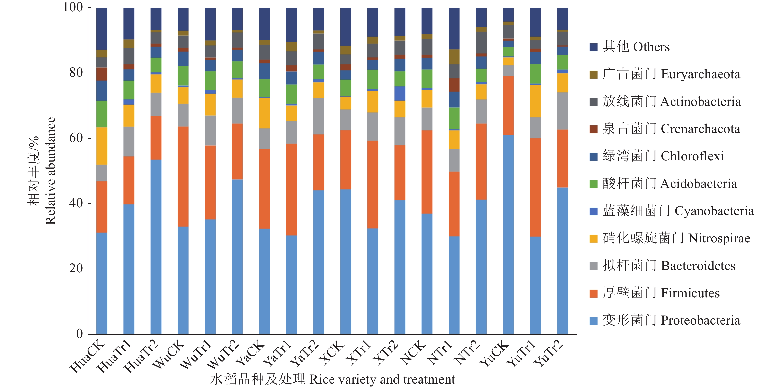选用Shannon指数、Simpson指数比较菌群中优势种种类的丰富程度,反映细菌群落多样性,选用Chao1指数和ACE指数反映细菌群落的数量丰富度。由表1可知,Shannon指数的范围是6.708~9.706,Simpson指数的范围是0.919~0.995,Chao1指数的范围是3024.949~4746.209,ACE指数的范围是3169.582~4339.961。Tr1、Tr2处理均显著提高了品种Yu的细菌群落多样性(P<0.05),但Tr1、Tr2之间差异不显著。Tr2处理显著提高水稻品种Yu的细菌群落丰富度(P<0.05)。Tr1处理显著提高了水稻品种Hua的细菌群落丰富度(P<0.05)。水稻品种Yu在CK处理时细菌群落多样性显著低于其他品种(P<0.05),但Tr2处理时水稻品种Yu的细菌群落丰富度显著高于品种Hua、Wu和N(P<0.05)。