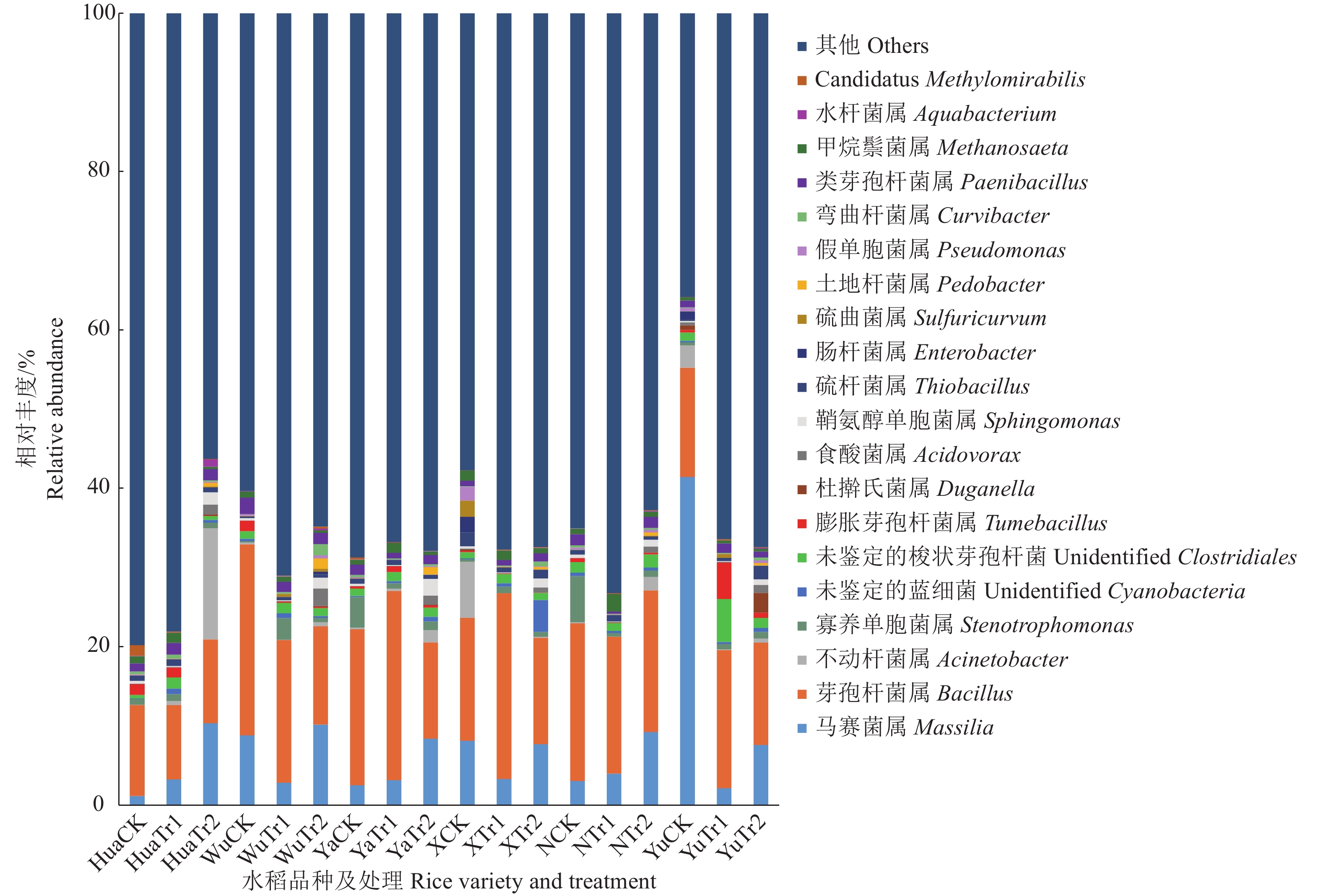 相对丰度较高的前20属细菌中,根据各细菌类群的平均相对丰度排名,将未能在97%相似度上分类的归类为Unidentified。由图3可见,马赛菌属Massilia相对丰度为1.2%~41.4%、芽孢杆菌属Bacillus相对丰度为9.4%~24.1%,均为优势菌属,除此之外,其他各细菌类群的平均相对丰度均小于2.0%,主要有不动杆菌属Acinetobacter、寡养单胞菌属Stenotrophomonas、未鉴定的蓝细菌(Unidentified Cyanobacteria)、未鉴定的梭状芽孢杆菌(UnidentifiedClostridiales)、膨胀芽胞杆菌属Tumebacillus等。食酸菌属Acidovorax、鞘氨醇单胞菌属Sphingomonas、土地杆菌属Pedobacter等菌属的相对丰度均在Tr2处理时较CK组显著上升(P<0.05),相对丰度较小或极小的菌属易在生物炭处理后出现显著性差异。马赛菌属在水稻品种Yu的CK处理相对丰度为41.4%,极显著高于其他水稻品种(P<0.01);不动杆菌属在水稻品种Hua的Tr2处理相对丰度为14.1%,显著高于其他水稻品种及处理(P<0.05)。可见,生物炭处理引起了对应土壤细菌群落结构组成在属水平上的变化,相对丰度较低或极低的土壤细菌类群更敏感,更容易受到生物炭的影响。