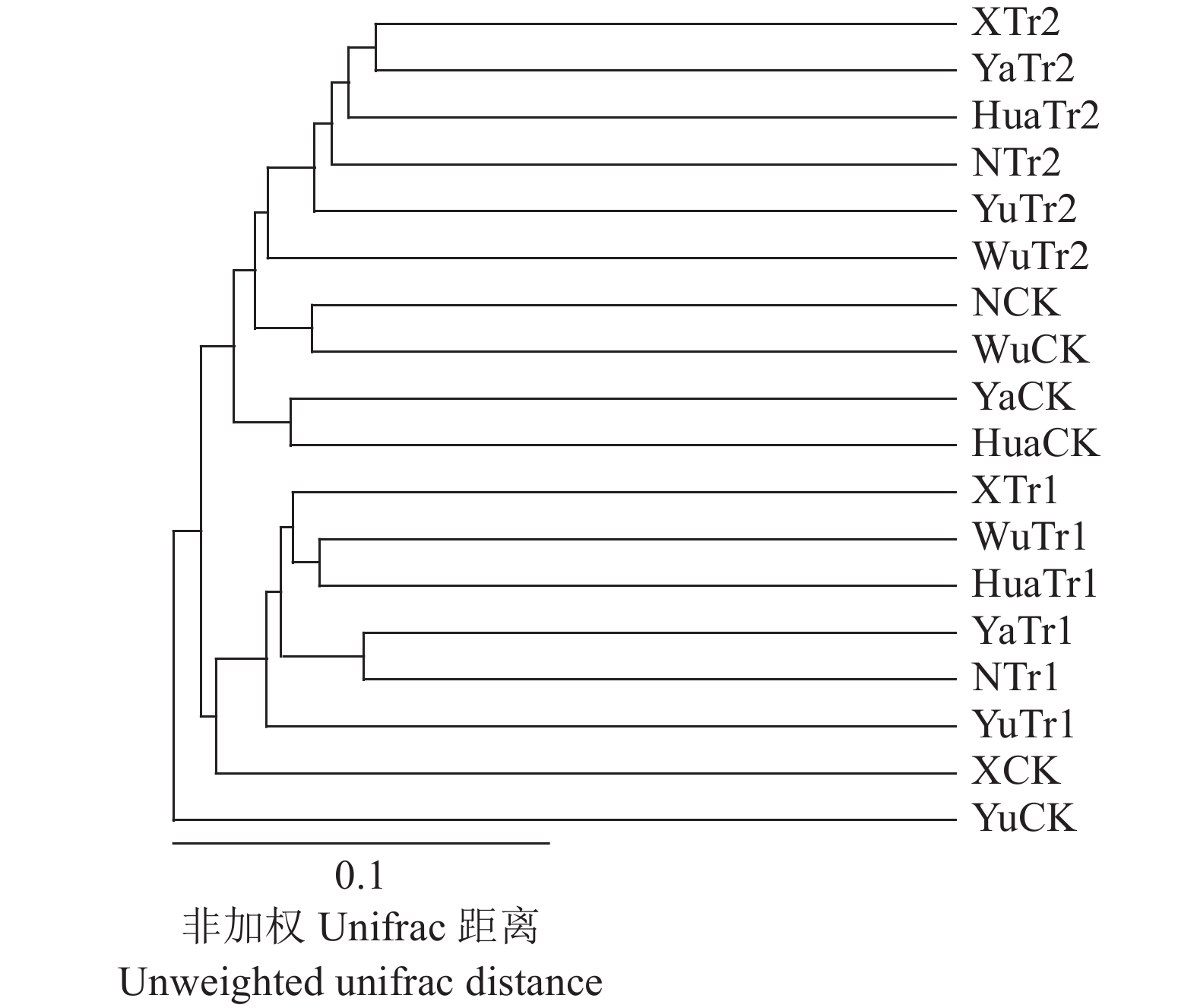 3.3 结论生物炭Tr1、Tr2处理显著提高了水稻品种Yu的土壤细菌群落多样性,Tr2处理显著提高了水稻品种Yu的细菌群落丰富度,生物炭Tr1处理显著提高了水稻品种Hua的细菌群落丰富度。细菌群落组成中占优势的菌门类型在生物炭不同施加量处理间无较大区别,但处理间细菌相对丰度上有所区别,某些水稻品种的生物炭Tr1或Tr2处理主要提高了变形菌门、拟杆菌门以及广古菌门的相对丰度,这些细菌在提高土壤养分方面具有一定作用。生物炭处理引起了对应土壤细菌群落结构组成在属水平上的变化,相对丰度较低或极低的土壤细菌类群更敏感,更容易受到生物炭的影响。与CK组相比,生物炭Tr1处理对土壤细菌群落组成及分布存在影响。水稻品种Hua和Yu的土壤细菌群落受生物炭施加影响变化较大。生物炭处理的差异主要体现在土壤细菌群落相对丰度上。
