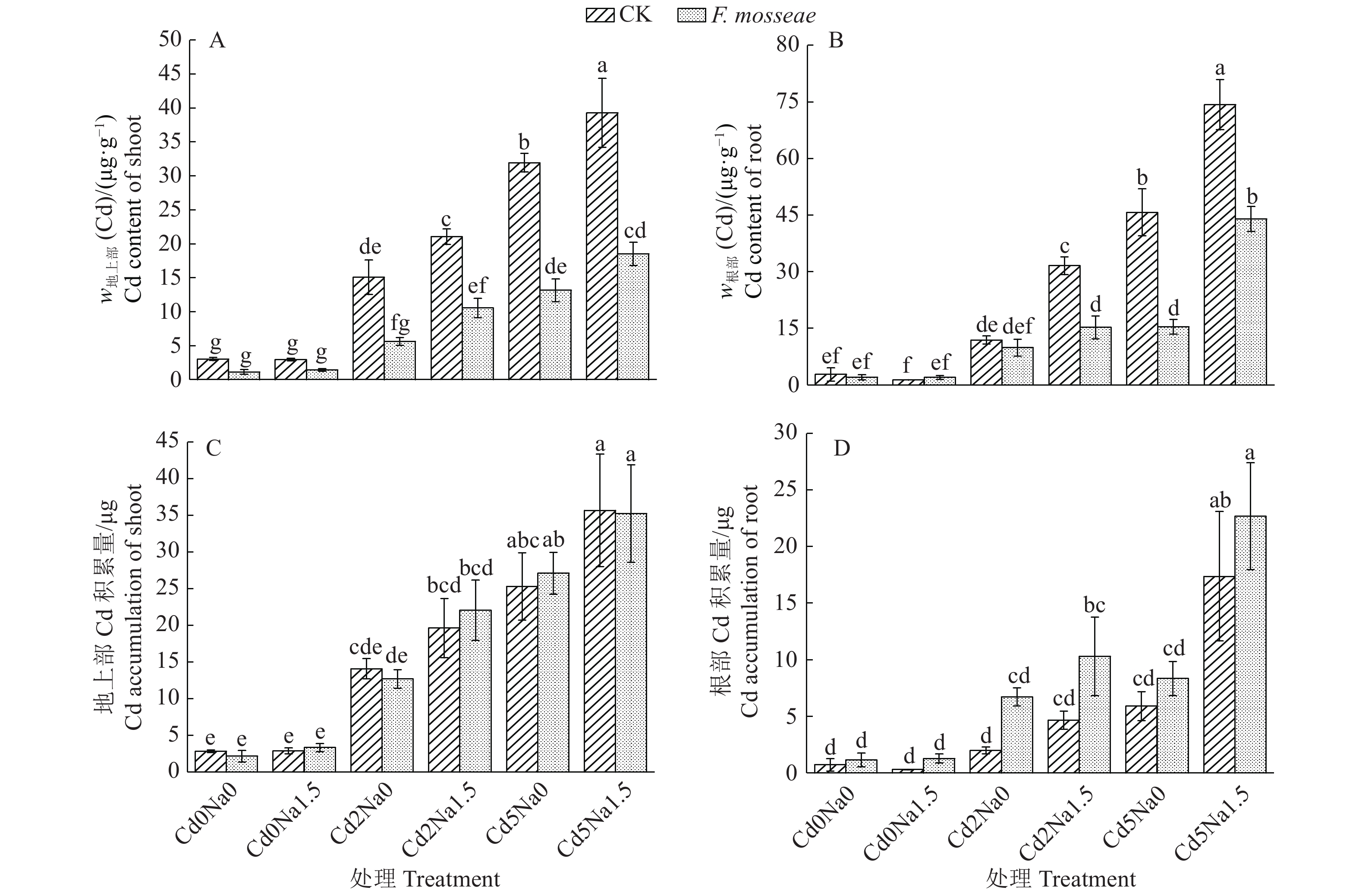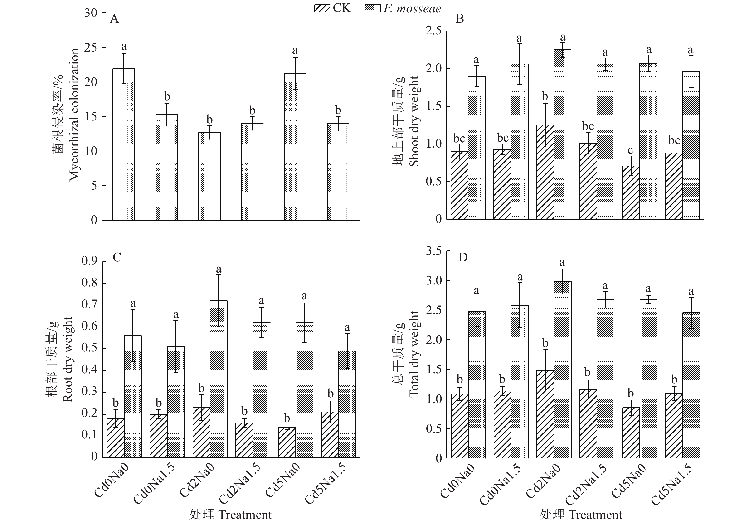 图 1 Funneliformis mosseae处理对Cd污染NaCl型土壤中菌根侵染率和生物量的影响 Fig. 1 Effects of Funneliformis mosseae treatment on mycorrhizal infection rate and biomass in Cd-contaminated NaCl type soil 各图中,柱子上方的不同小写字母表示处理间差异显著(P<0.05,Duncan’s法) In each figure,different lowercase letters on bars indicate significant differences among treatments (P<0.05, Duncan’s test) |