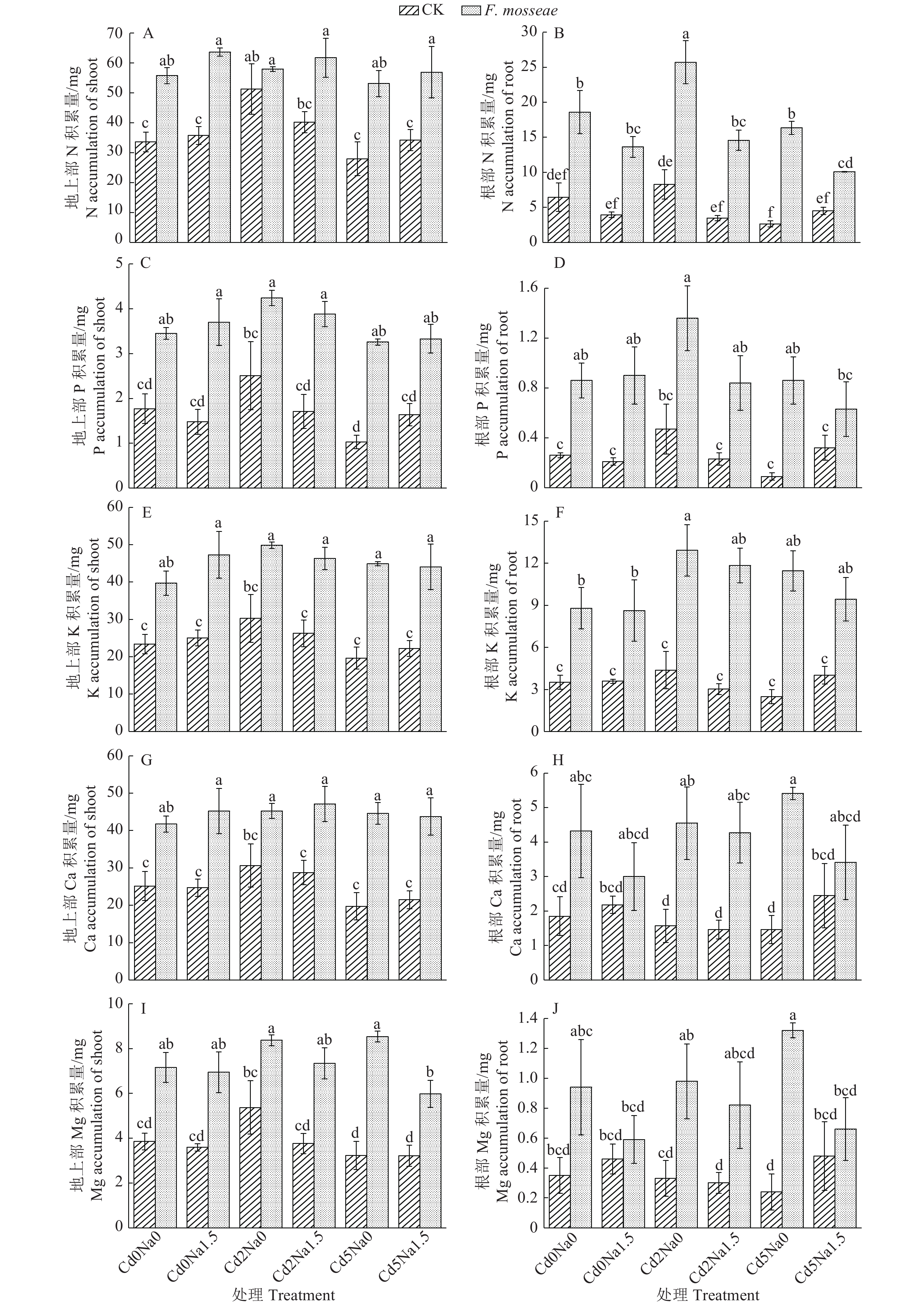 图 2 Funneliformis mosseae处理对Cd污染NaCl型土壤中地上部和根部N、P、K、Ca和Mg含量的影响 Fig. 2 Effects of Funneliformis mosseae treatment on the contents of N, P, K, Ca and Mg of shoot and root in Cd-contaminated NaCl type soil 各图中,柱子上方的不同小写字母表示处理间差异显著(P<0.05,Duncan’s法) In each figure,different lowercase letters on bars indicate significant differences among treatments (P<0.05, Duncan’s test) |