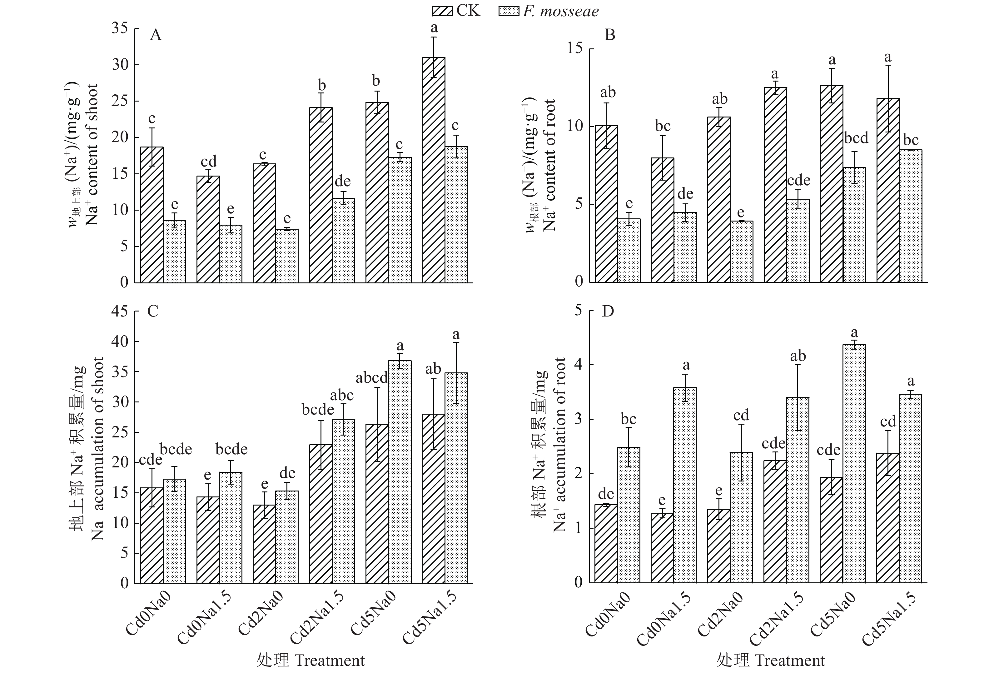 3.2 生物量植物在面对逆境胁迫时的生物量能直观地反映出其耐受性[8]。有研究发现,小果白刺随着NaCl浓度的升高各部位的生物量先升高后降低[27]。左凤月[28]在研究小果白刺耐盐性时发现3%NaCl处理显著增加了小果白刺的生物量。在本研究中,盐分处理对小果白刺的生物量并没有产生显著影响,这可能是因为1.5 g·kg−1NaCl处理浓度较低,既没有对小果白刺的生长产生促进作用,也未达到小果白刺的耐盐阈值。本研究显示,只有在不接种AM真菌处理组,Cd5Na0处理显著降低了Cd2Na0地上部生物量,而其他处理均未受到Cd含量的显著影响,这可能说明了小果白刺对重金属Cd的耐受性比较高。盐生植物通常能够在细胞水平上将重金属束缚在细胞壁和细胞膜上,从而阻止重金属进入细胞内对其产生毒害[29]。同时,盐生植物能够在抵御盐胁迫时合成脯氨酸,提高对重金属的耐受性[30]。已有研究结果证明,AM真菌能显著地促进盐胁迫下番茄的生长和重金属Cd胁迫下玉米的生长[31-32]。本研究结果显示,AM真菌与植物共生后显著促进了Cd污染NaCl型土壤中小果白刺的生长。这可能是接种AM真菌后真菌菌丝扩大了植物根系吸收营养元素的范围,同时也影响了植物对Na+和Cd的吸收积累,从而促进了植物的生长。