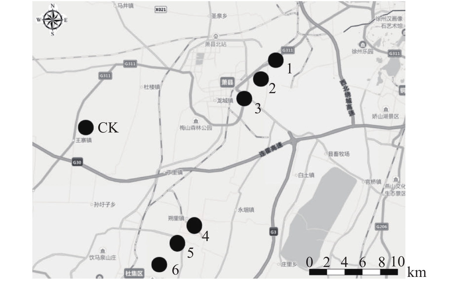 图 1 采样点分布示意图 Fig. 1 Distribution of sampling site CK:对照区,1:距离沈庄矿井100 m的矿区,2:距离沈庄矿井1 500 m的矿区,3:距离沈庄矿井3 000 m的矿区,4:距离石台矿井100 m的矿区,5:距离石台矿井1 500 m的矿区,6:距离石台矿井3 000 m的矿区 CK: Control area, 1: Mining area of 100 m away from Shenzhuang Mine, 2: Mining area of 1 500 m away from Shenzhuang Mine, 3: Mining area of 3 000 m away from Shenzhuang Mine, 4: Mining area of 100 m away from Shitai Mine, 5: Mining area of 1 500 m away from Shitai Mine, 6: Mining area of 3 000 m away from Shitai Mine |