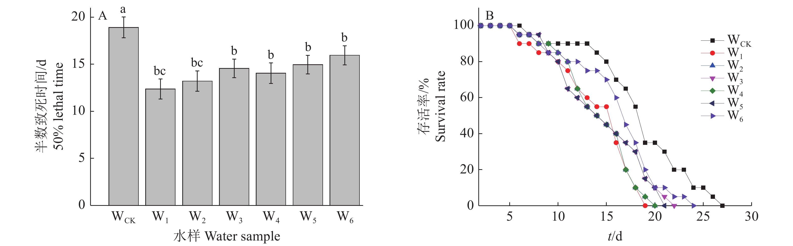 图 2 矿区水环境对秀丽隐杆线虫半数致死时间和存活率的影响 Fig. 2 Influence of mining area water environment on lethal time of 50% and survival rate of Caenorhabditis elegans 图A柱子上的不同小写字母表示样品间差异显著(P<0.05,LSD法) Different lowercase letters on the columns in Fig. A indicate significant differences among different samples (P<0.05, LSD method) |