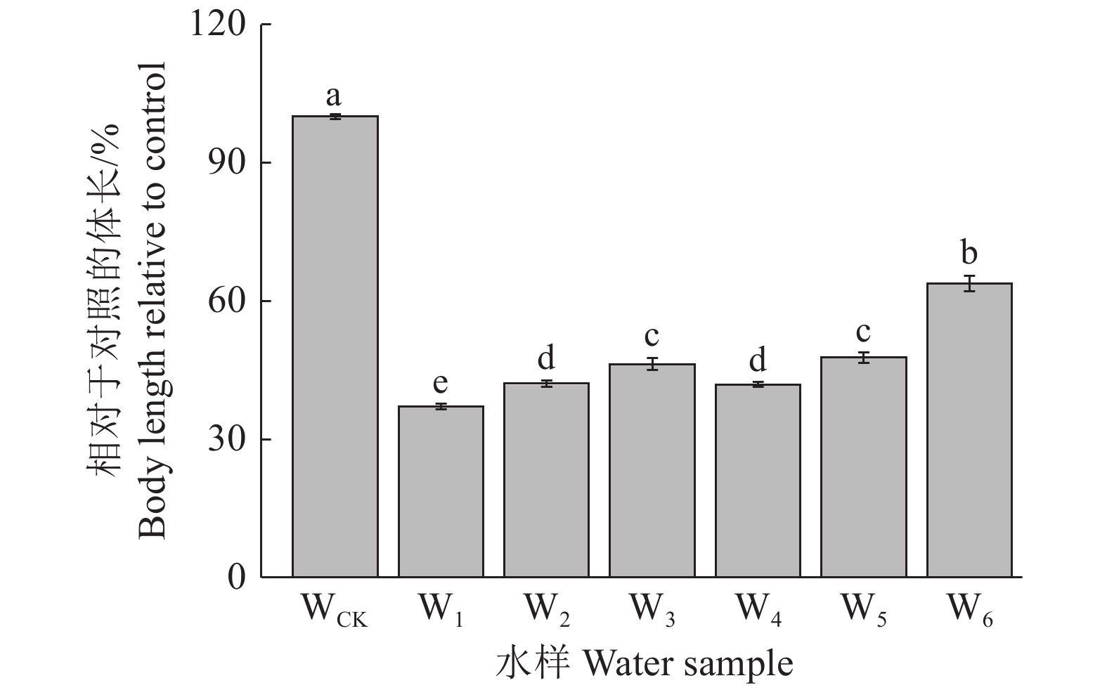 图 3 矿区水环境对秀丽隐杆线虫体长的影响 Fig. 3 Effects of mining area water environment on body length of Caenorhabditis elegans 柱子上的不同小写字母表示样品间差异显著(P<0.05,LSD法) Different lowercase letters on the columns indicate significant differences among different samples (P<0.05, LSD method) |