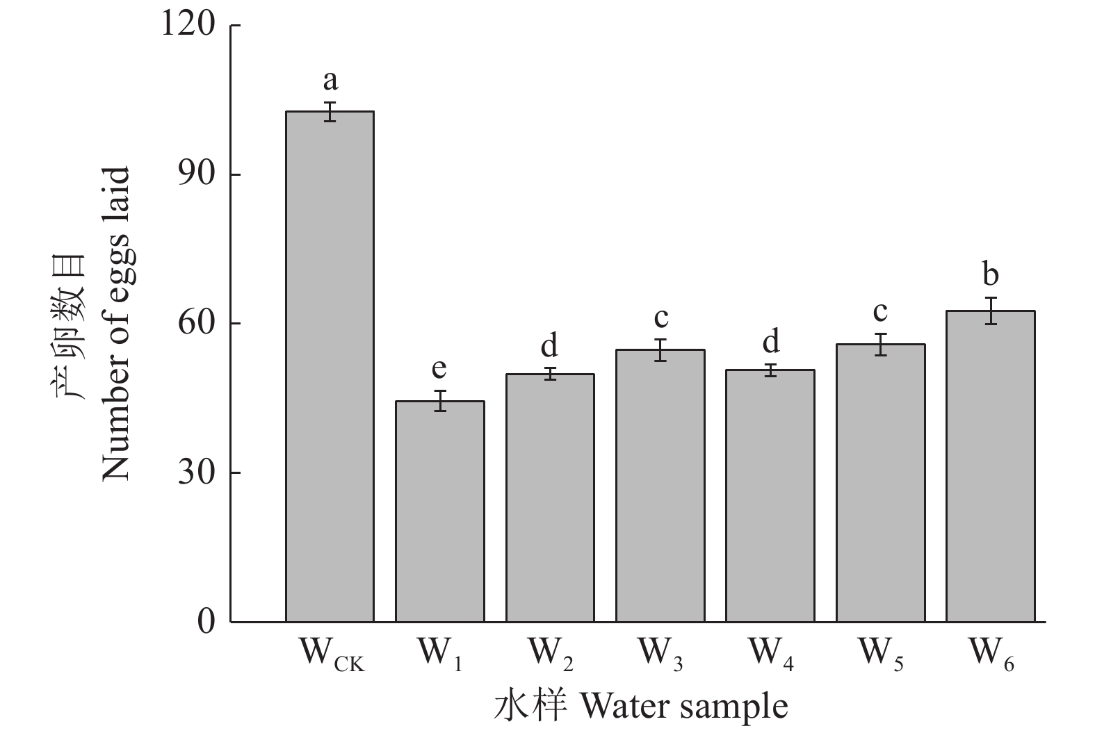图 4 矿区水环境对秀丽隐杆线虫产卵数的影响 Fig. 4 Effects of mining area water environment on the number of eggs laid by Caenorhabditis elegans 柱子上的不同小写字母表示样品间差异显著(P<0.05,LSD法) Different lowercase letters on the columns indicate significant differences amnong different samples (P<0.05, LSD method) |