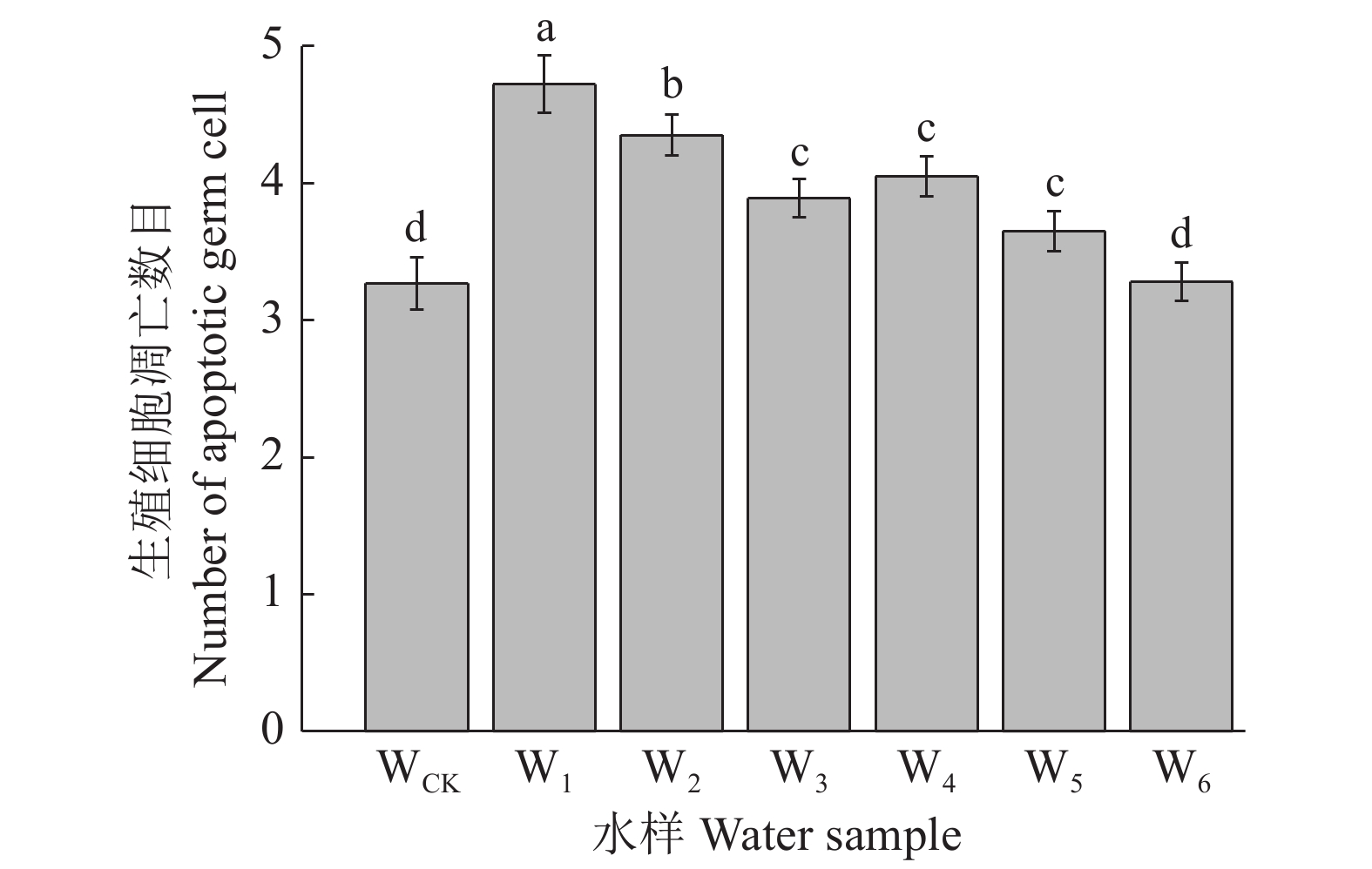 图 5 矿区水环境诱导的秀丽隐杆线虫生殖细胞凋亡 Fig. 5 The apoptosis of Caenorhabditis elegans germ cells induced by mining area water environment 不同样品柱子上的不同小写字母表示样品间差异显著(P<0.05,LSD法) Different lowercase letters on the columns indicate significant differences among different samples (P<0.05, LSD method) |